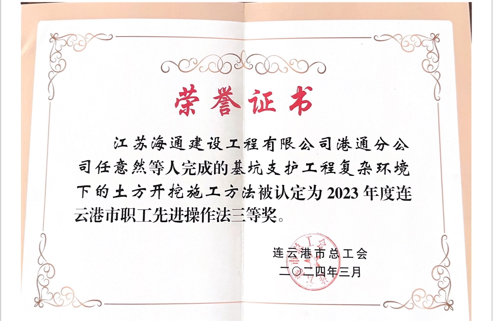 近日,从连云港市总工会传来喜讯,江苏海建千亿官方站网站登录入口申报的《基坑支护工程复杂环境下的土方开挖施工方法》获得2023年度职工先进操作法三等奖。