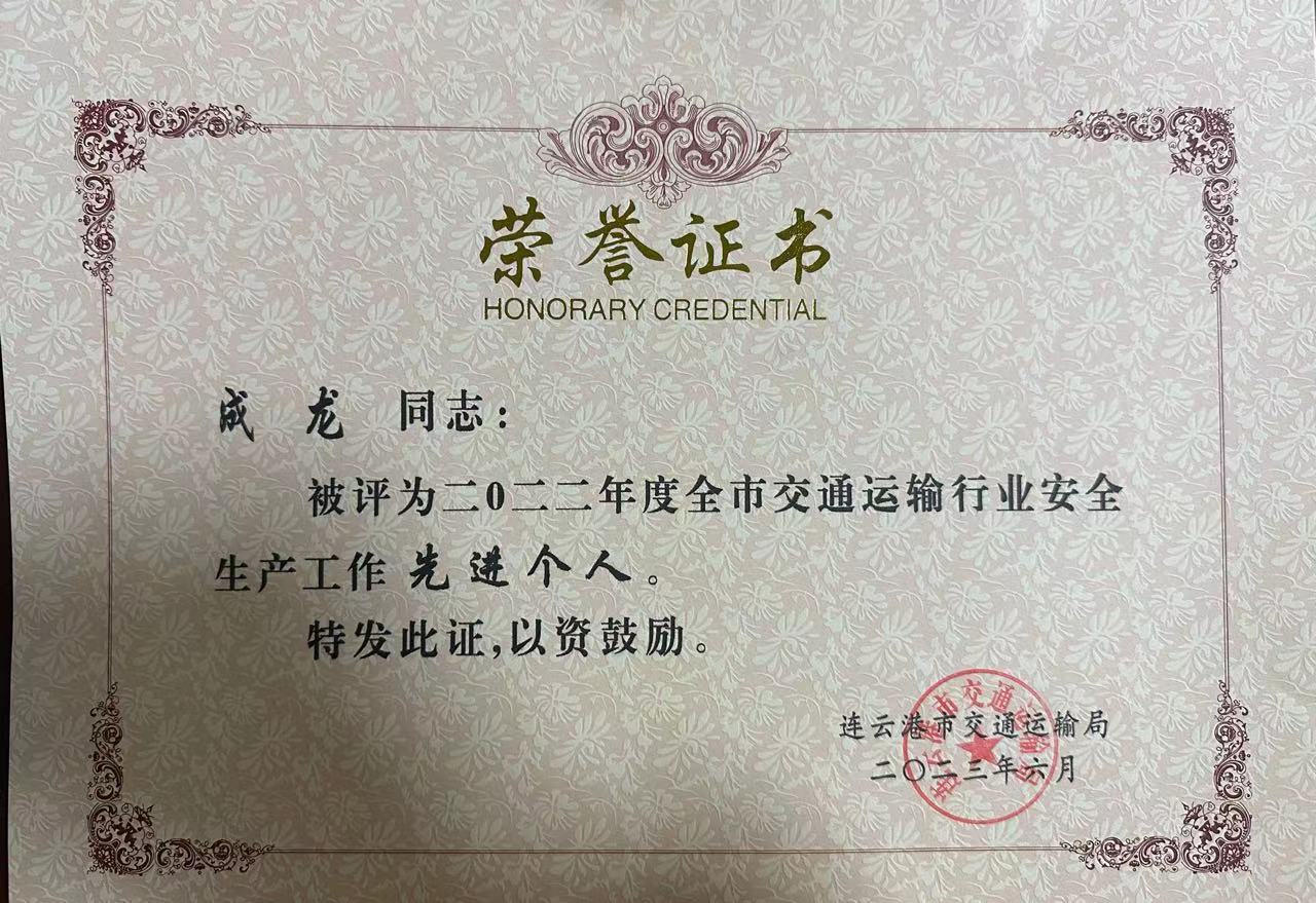 日前,《关于表彰2022年度全市交通运输行业安全生产工作先进单位、先进集体和先进个人的通报》,连汽出租千亿官方站网站登录入口获得2022年度全市交通运输行业安全生产工作先进单位,千亿官方站网站登录入口支部书记成龙同志被评为2022年度全市交通运输行业安全生产工作先进个人荣誉称号。