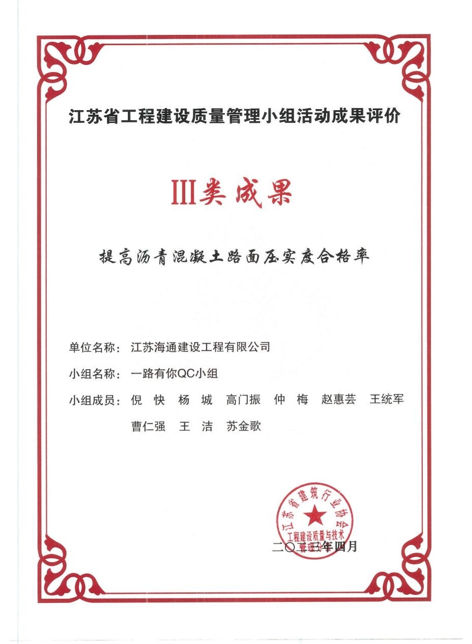 近日,从连云港市质量协会获悉,江苏海建千亿官方站网站登录入口“一路有你”QC小组成果《提高沥青混凝土路面压实度合格率》荣获江苏省工程建设质量管理小组活动成果评价三类成果奖。