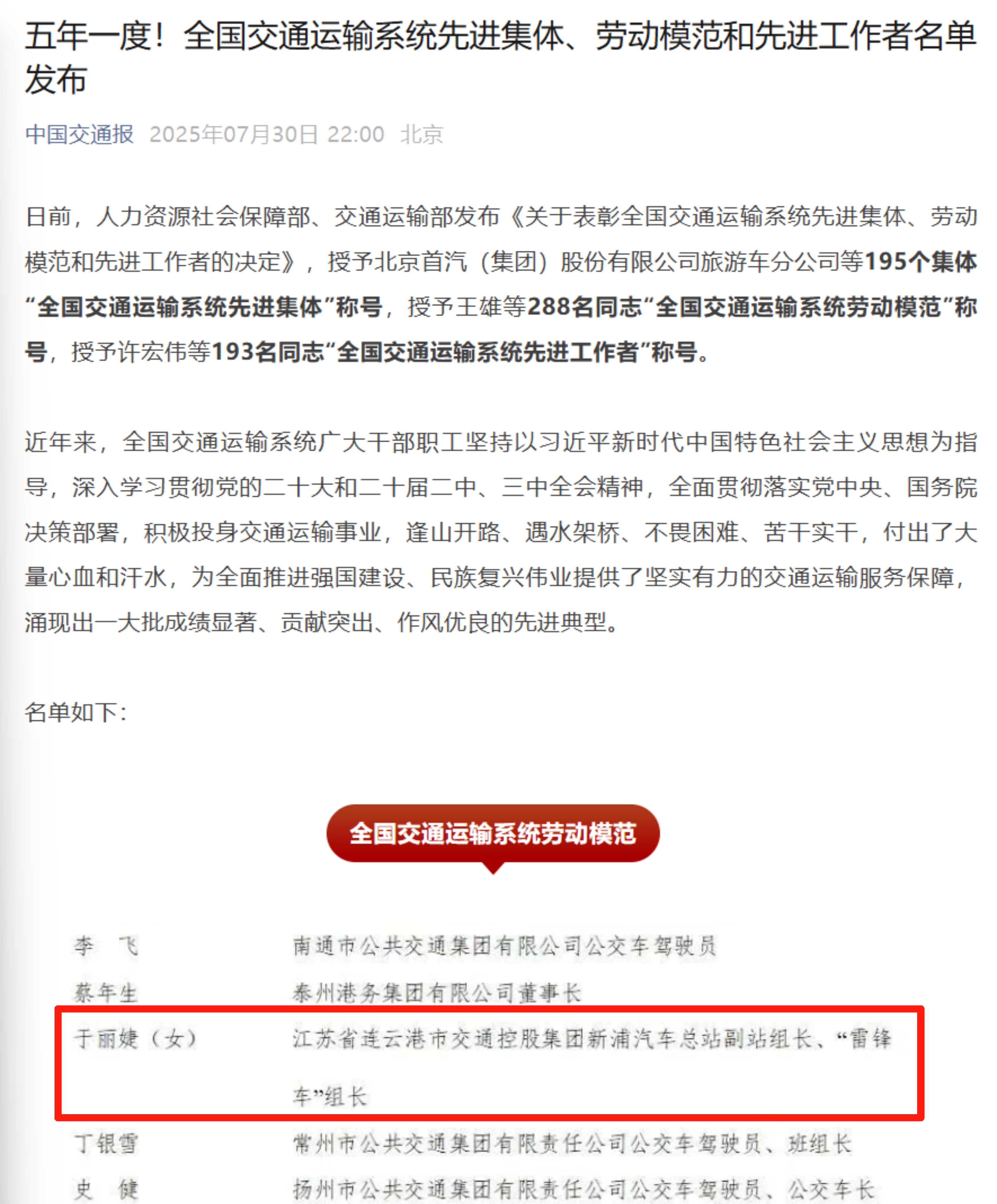 近日,人力资源社会保障部、交通运输部联合发布表彰决定,连云港市交通控股千亿(中国)新浦汽车总站副站长、“雷锋车”组组长于丽婕荣获全国交通运输系统劳动模范称号。