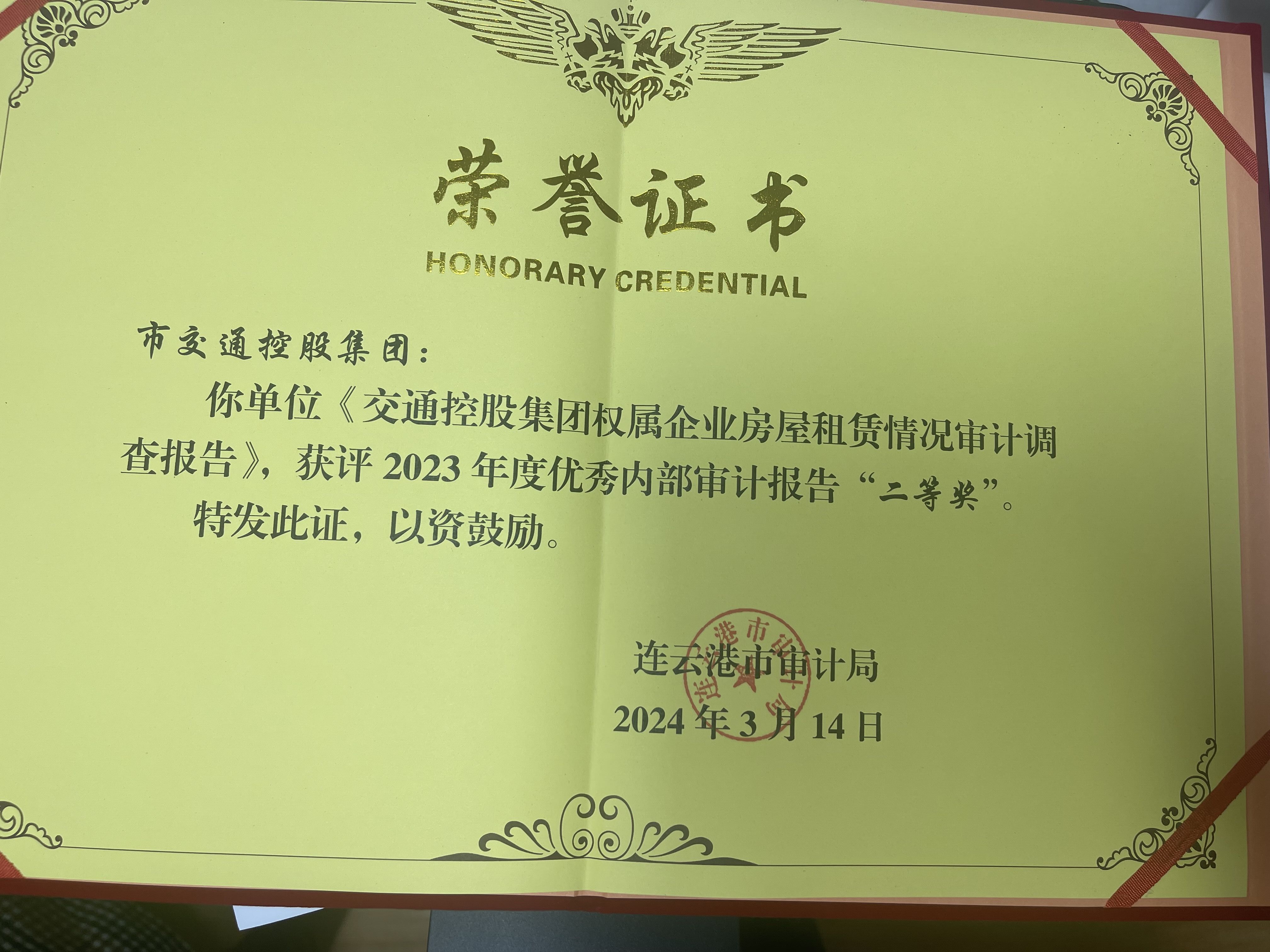日前,千亿(中国)在市审计局举办的2023年度全市内部审计工作评比中获评“先进单位”。千亿(中国)审计部报送《交通控股千亿(中国)权属企业房屋租赁情况审计调查报告》获评2023年度优秀内部审计报告“二等奖”。