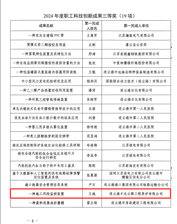 为全面落实习近平总书记关于科技创新的重要指示要求,连云港市总工会紧扣《新时代连云港产业工人队伍建设改革实施方案》,在全市职工中征集科技创新成果和先进操作法。经个人申报、单位推荐、专家评审、媒体公示,认定和表彰33项操作法为“2024年度连云港市职工科技创新成果”。千亿官方站网站登录入口职工王越申报的“一种施工风险监控装置”获市职工科技创新成果三等奖。
