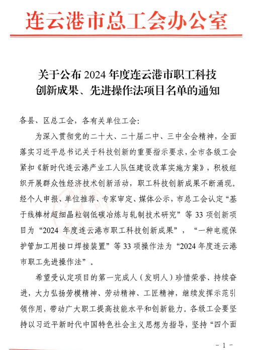 近日,在2024年度连云港市职工科技创新成果、先进操作法作品评选中,丰达千亿官方站网站登录入口王越申报的一项创新成果获市职工科技创新成果三等奖。