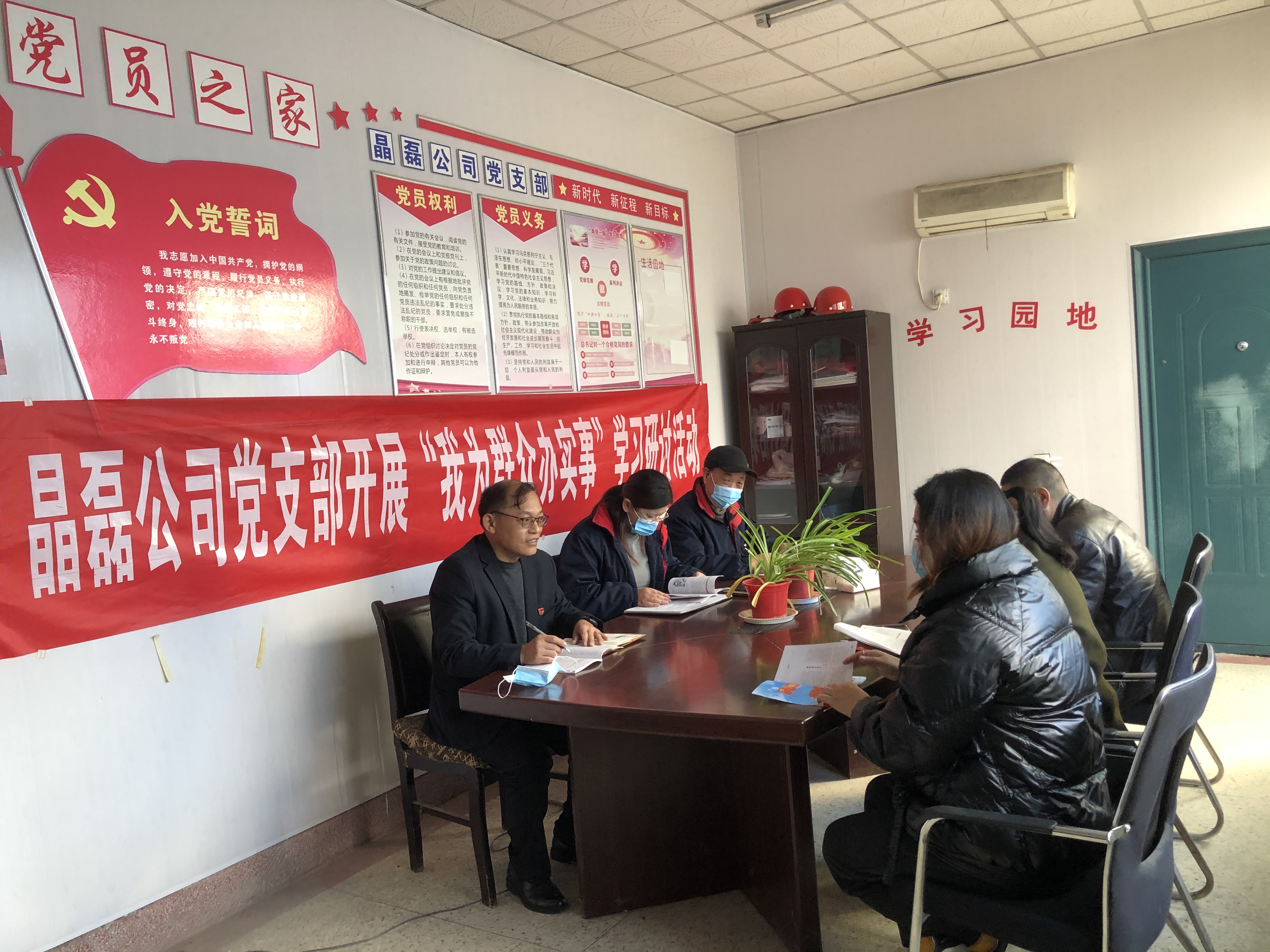 11月17日上午,物流千亿(中国)晶磊千亿官方站网站登录入口党支部在石材物流园党员活动室开展“我为群众办实事”主题党日活动,传达学习中央、省市委关于“我为群众办实事”实践活动的新部署新要求,切实把思想和行动统一到中央、省市委的部署要求上来,开展“我为群众做什么”大讨论,教育引导广大党员以“群众利益无小事”的态度,当好群众知心人、贴心人、暖心人。