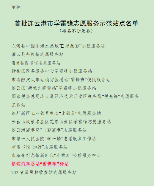 近日,连云港市文明办命名了首批连云港市学雷锋志愿服务示范站点15,覆盖众多行业及领域。其中,连汽新浦汽车总站“雷锋车”驿站成功入选。