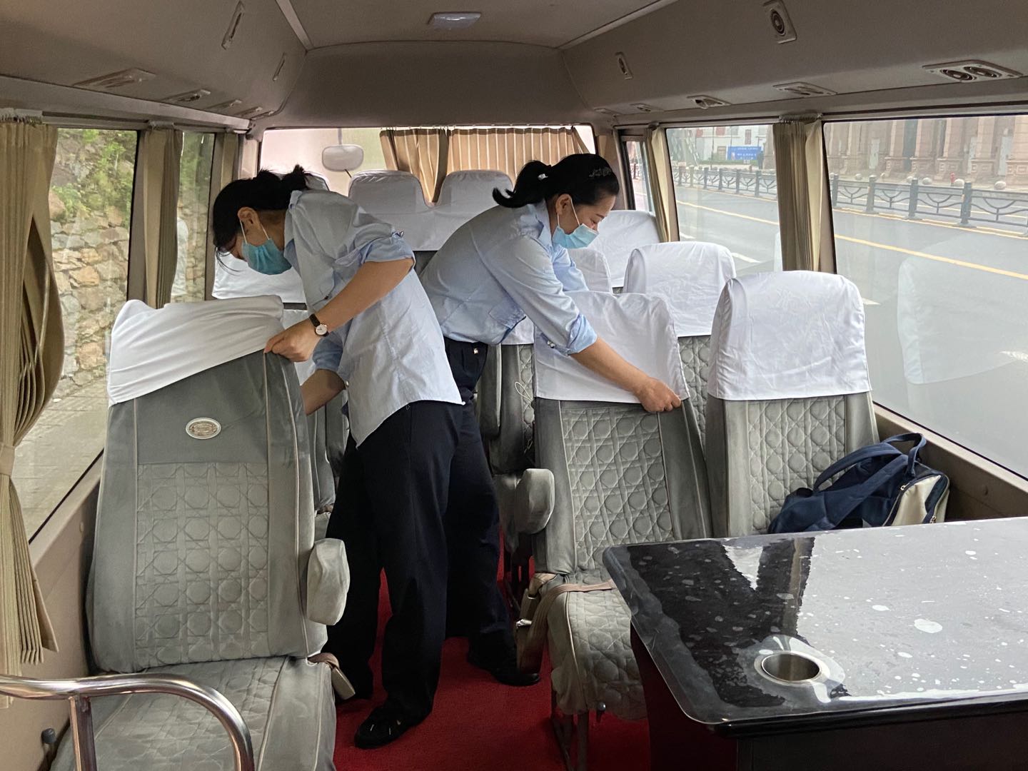 烈日似火,大地就像大蒸笼一样,热得使人喘不过气来。炎炎烈日人人避之不及,城市动车连云站的姑娘们却毫不畏惧,她们利用自己休息的时间帮助城市动车通勤车的曹师傅一起打扫车内卫生,清扫车内地面,擦拭车窗玻璃,将车上座位套一个个取下,仔细清洗干净后再一个个套上去。曹师傅感谢姑娘们的帮忙,姑娘们笑着说“大家每日上班都要乘车近3个小时,干净卫生的车内环境,既能让大家有一个舒适的乘车感受,又能让大家每天都能有个好心情,大家以良好的精神状态投入到一天的工作中去。”自城市动车开通以来,城市动车的工作人员每日早上五点乘坐通勤车前往连云站,晚上等动车结束后再乘坐通勤车返回海州,如果说通勤车是工作人员临时的家,每个座位就是大家的临时床位,大家每日早出晚归只能利用乘车这段时间给自己补补觉。