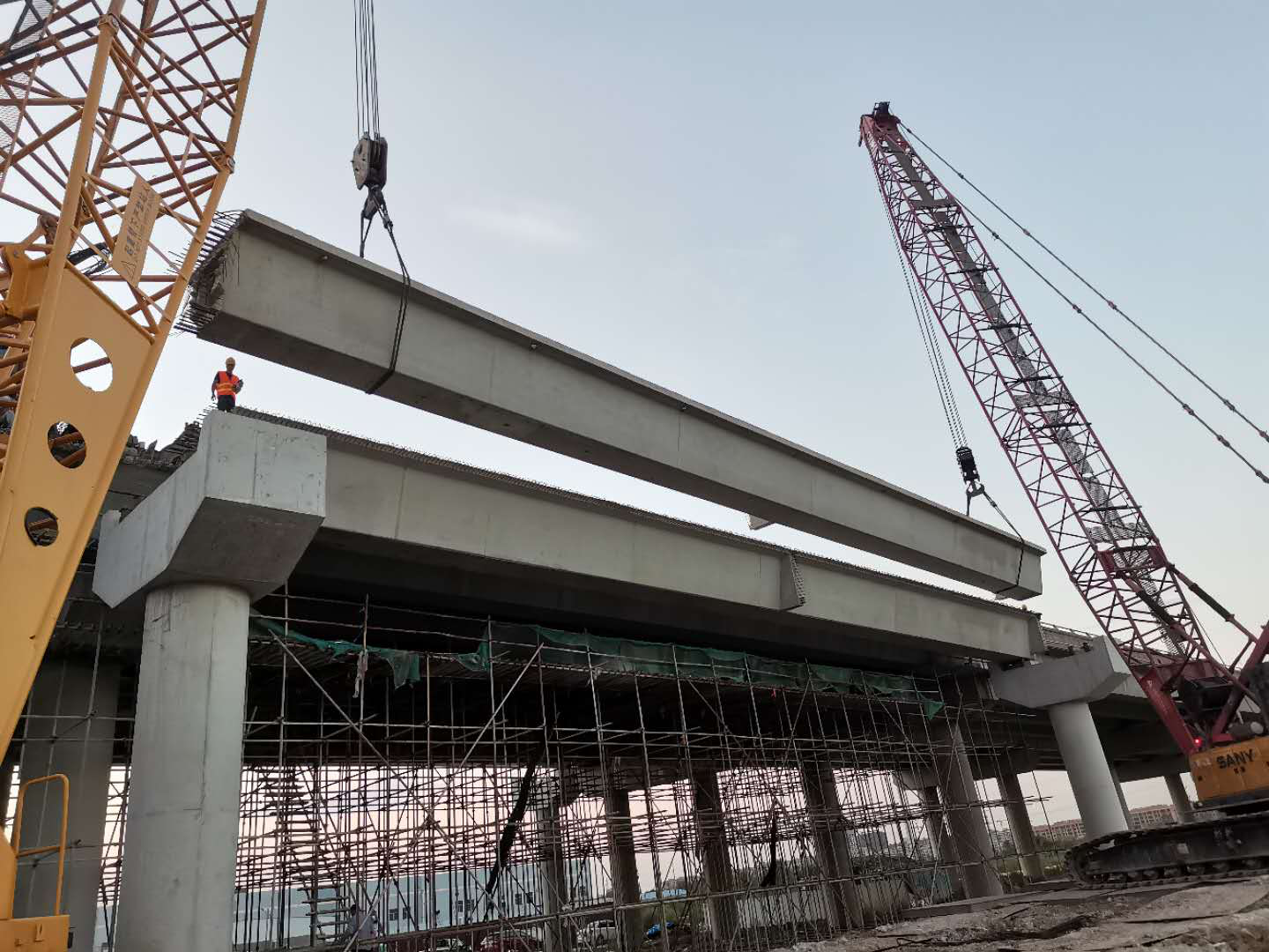 因箱梁架设需对连霍高速既有桥梁防撞墙、翼缘板进行破除,需对既有高速实施封闭施工交通管制,封闭时间从8月27日起至12月31日。为保障本市旅游业及港口关联企业生产经营不受连霍高速新墟互通新增匝道施工影响,市交通千亿(中国)调整交通组织方案,由全幅封闭改为半幅封闭半幅借道通车模式,给工程进度管理以及施工安全带来较大困难。为了确保年底建成这一工期目标,交通千亿(中国)组织参建单位研究细化施工方案,结合项目施工的特点,增加一倍架梁设备,这将有效缩短架梁施工周期。