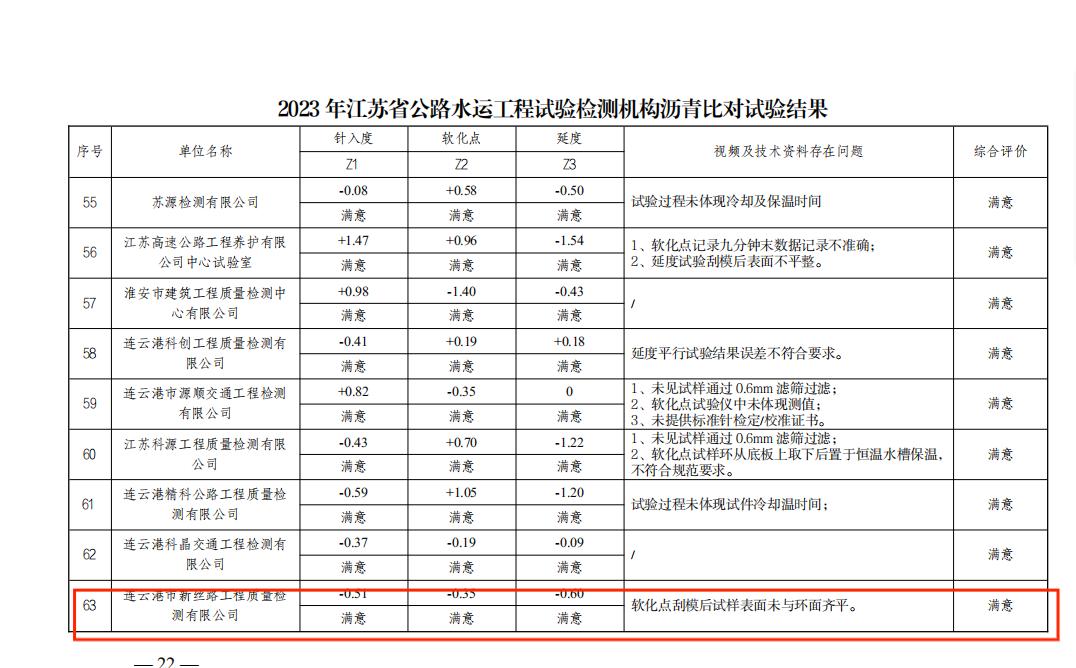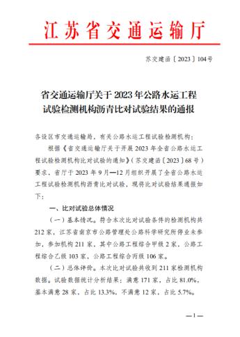 日前,江苏省交通运输厅组织开展了全省公路水运工程试验检测机构沥青比对试验,江苏海建新丝路检测千亿官方站网站登录入口高度重视,认真参与。近日,根据苏交建函〔2023〕104号发文通报,千亿官方站网站登录入口在此次比对试验中结果为“满意”。