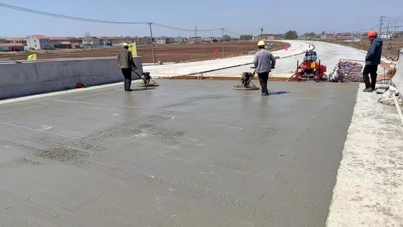 此次桥面铺装以沭北运河大桥第5联做为桥面铺装首件,该大桥全长499米,本次浇筑首件长度为120米,宽度为12.5米,厚度为10厘米。为保证桥面工程质量,项目部制定桥面系施工方案,对作业人员进行专项施工技术及安全交底。施工过程中,项目部强化过程管控,严格把控原材料、桥面清理、钢筋网铺设、桥面钢筋保护层、桥面平整度、混凝土质量等工序。本次桥面铺装采用泵车输送混凝土浇筑,三滚轴混凝土摊铺机进行混凝土摊铺整平,座架式抹光机收面,分段施工完成后进行覆盖养生,确保质量符合设计及规范要求。本次首联桥面铺装的顺利浇筑,为项目整体桥面系施工提供了有效指导,也为后续桥梁施工打下了坚实基础。