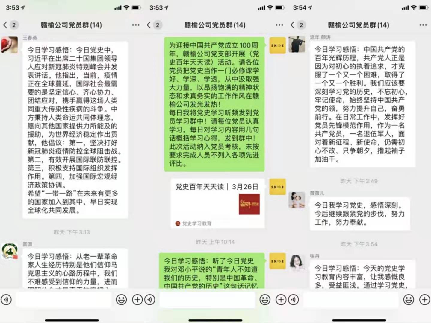 为迎接中国共产党成立100周年,深入学习党史教育,连汽赣榆千亿官方站网站登录入口党支部创新学习形式,自4月7日以来,利用党员学习群开展“党史天天讲”微感悟活动。