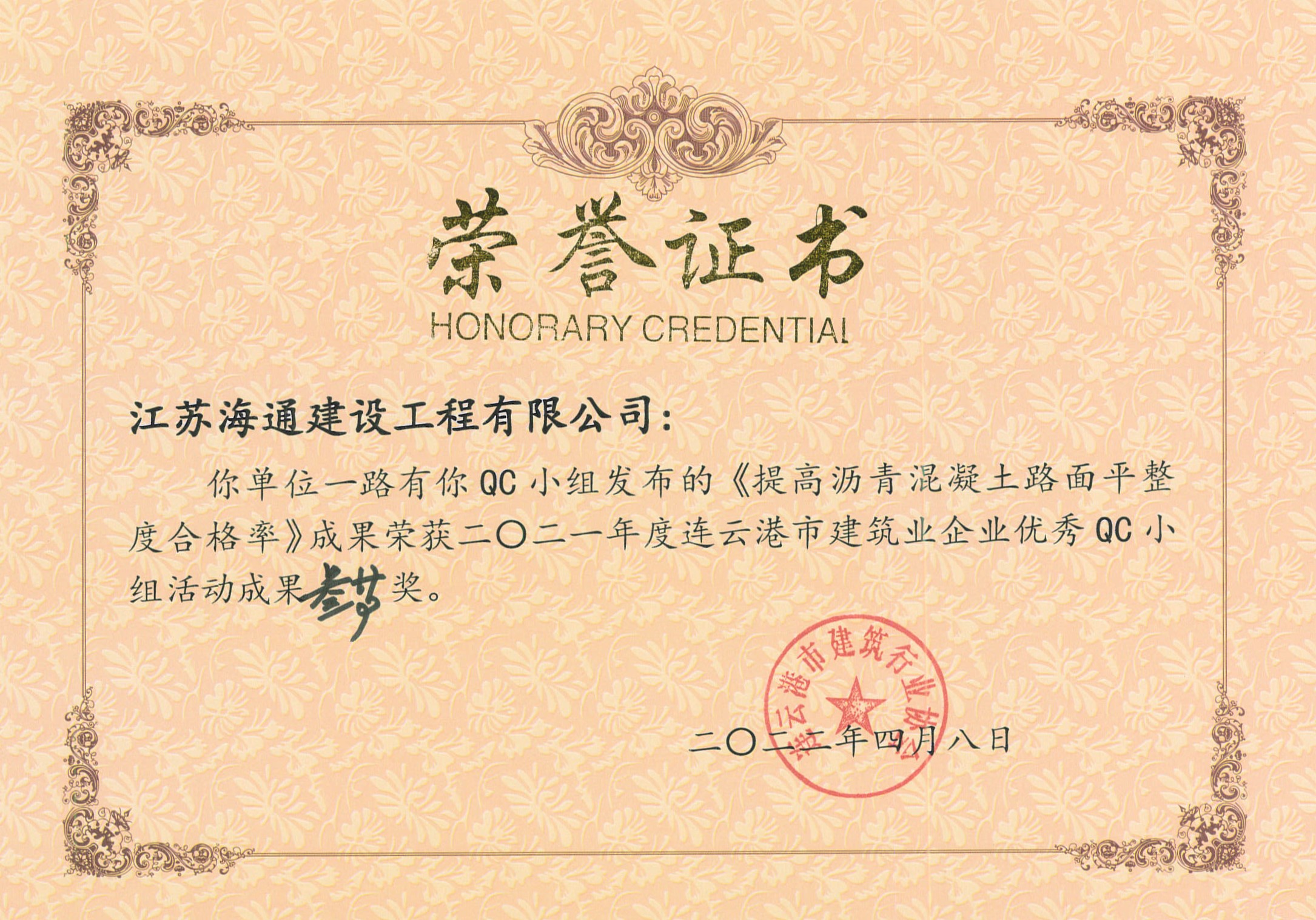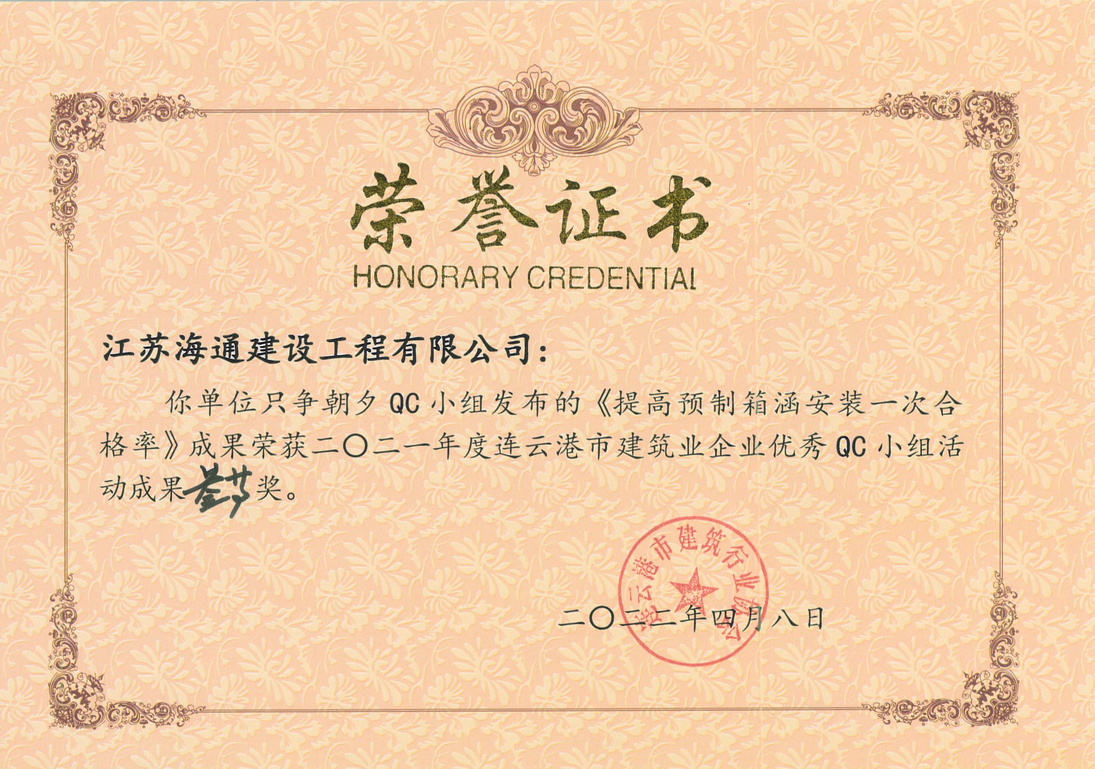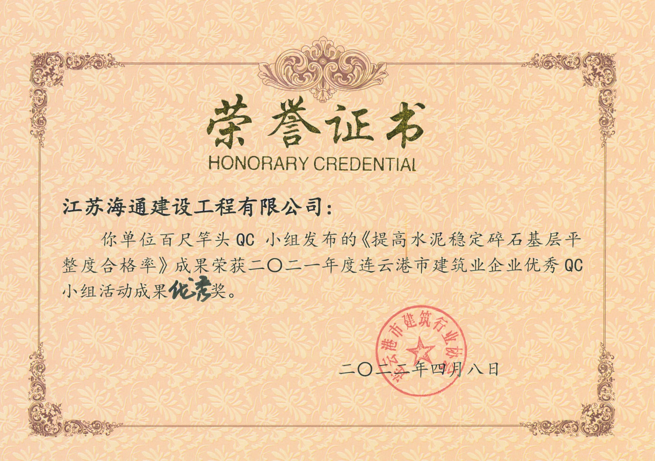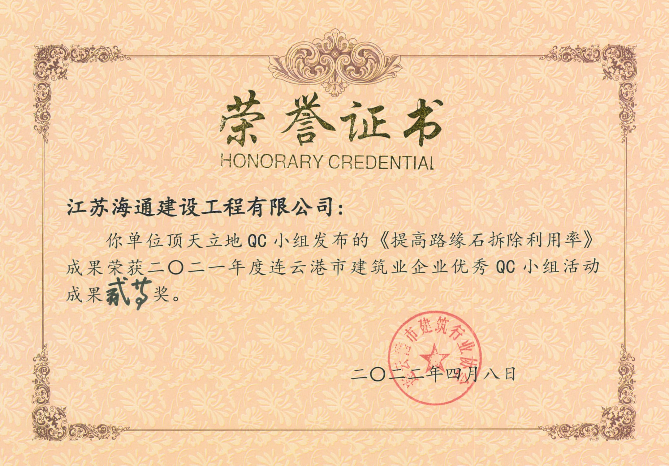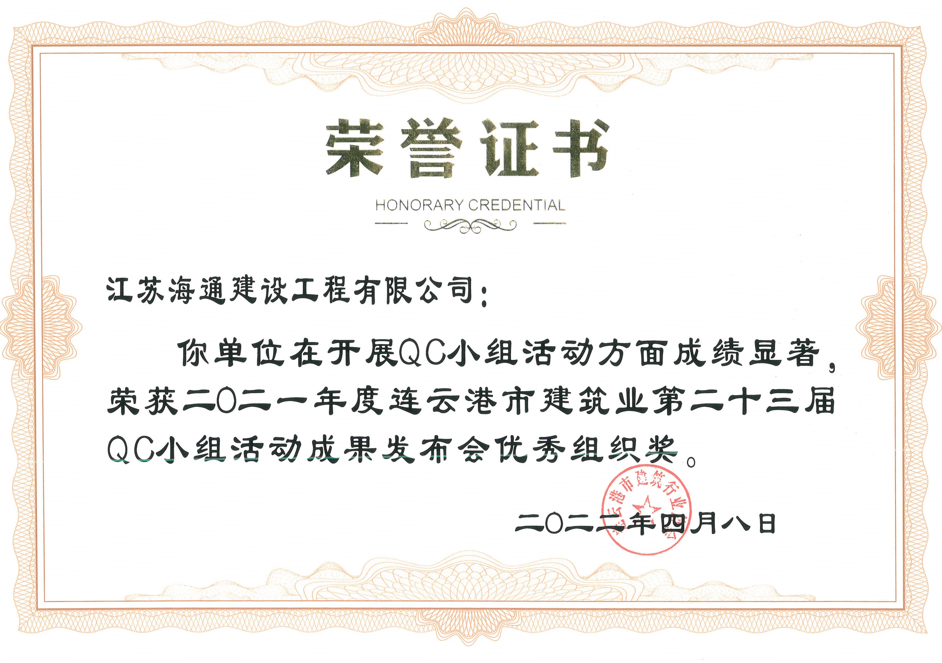 近日,由连云港市建筑业协会发布的“关于表彰2021年度连云港市建筑业优秀QC小组活动成果及先进单位的决定”(连建协[2022]02号)中获悉,海建千亿官方站网站登录入口申报的5项QC成果全部获奖,分别荣获一等奖1项,二等奖1项,三等奖2项,优秀奖1项,同时,海建千亿官方站网站登录入口荣获QC小组活动先进单位。