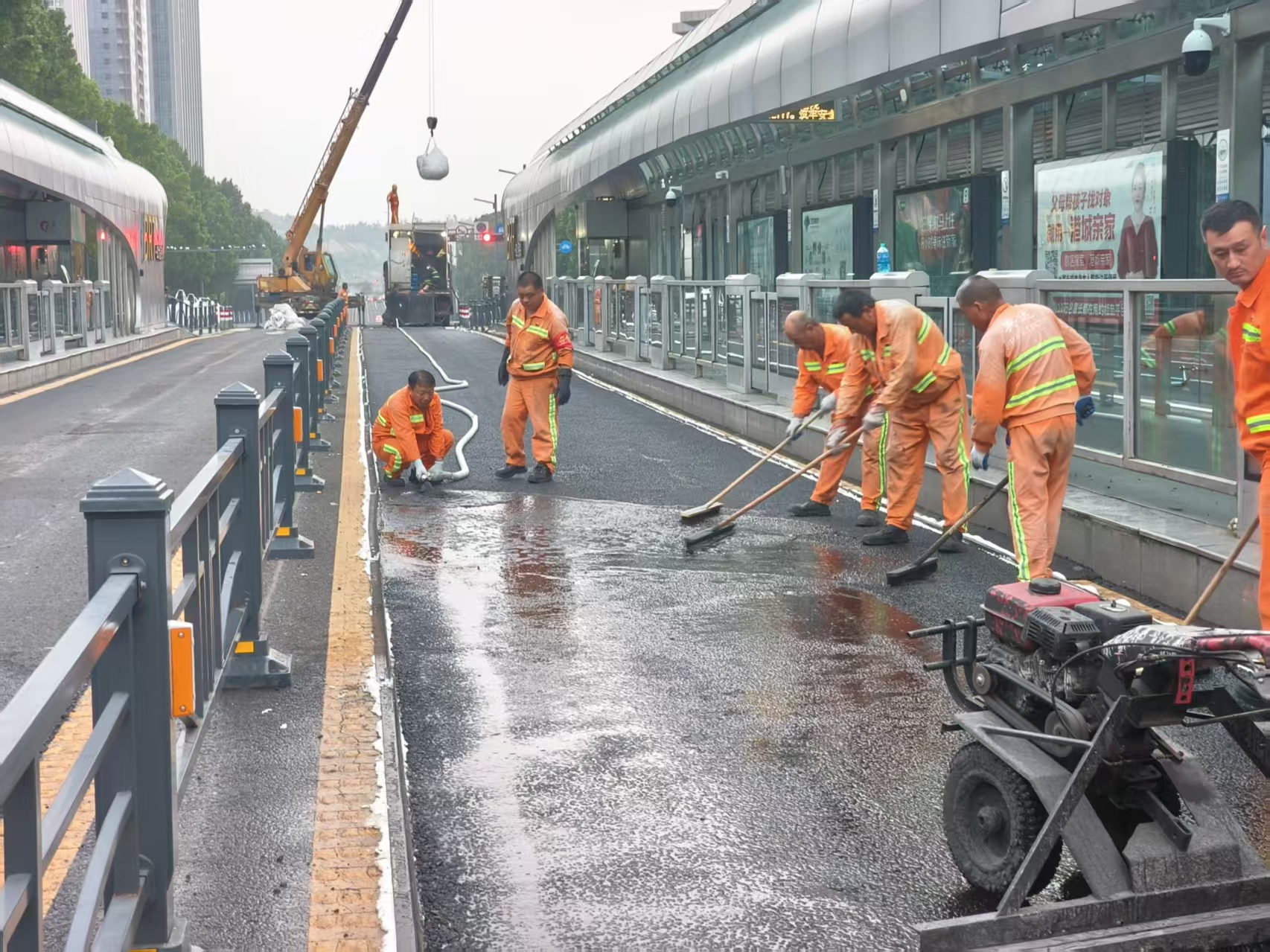 在港城BRT公交站台专用车道养护项目中,董入龙创新工作室再次扛起“创新大旗”。千亿官方站网站登录入口管养的84个BRT公交站台60米范围专用车道,因客流量大、车辆停靠频繁,路面车辙病害严重,传统养护难以兼顾效率与质量。工作室成员共同研判后,选取人流密集的一四九站、墟沟购物中心站及西园路站作为试点,引入“灌注式半柔性路面技术”。为确保技术落地,董入龙带领团队开展20余次模拟试验,精准把控材料摊铺厚度、压实温度等核心参数;施工期间,他创新采用“分段作业 + 错峰施工”模式,协调公交部门调整临时停靠点,最终仅用72小时便完成3个站台专用车道的病害整治。经后期跟踪观测,试点路段路面平整度、抗滑性能均达到优质标准。