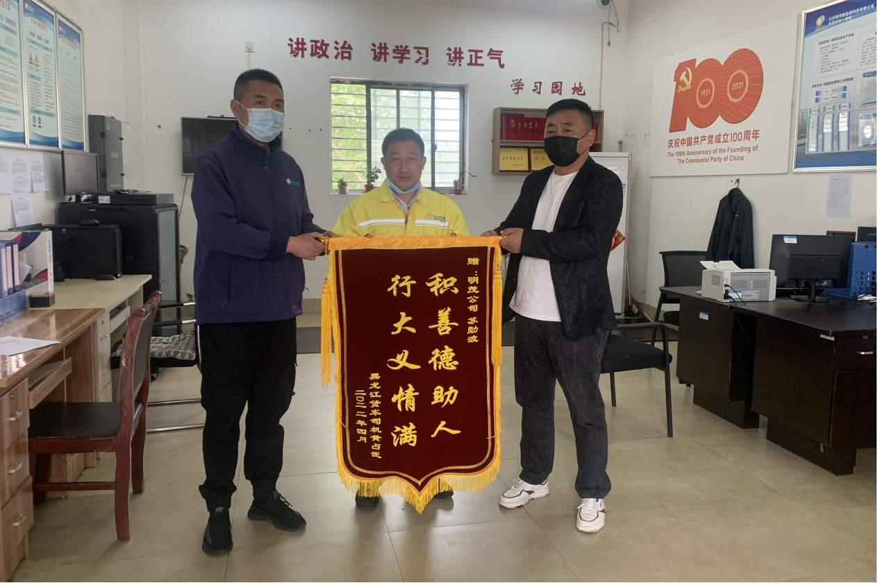 4月28日上午,一面写着“积善德助人 行大义情满”的锦旗送到了眀茂新能源东区大港路充电场站员工苏勋波的手中,货车司机黄占武紧紧地握着他的手说道,“谢谢苏师傅,谢谢见义勇为的英雄!”