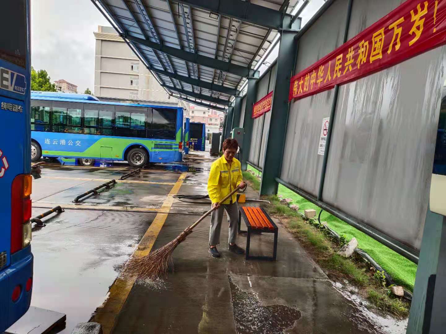 目前已进入汛期,暴雨天气明显增多,一线场站部分区域形成积水,为尽快恢复场站环境的干净卫生,保障一线场站公交车辆通畅通行,进一步落实场站工作职责,7月20日,明茂千亿官方站网站登录入口组织充电班组成员对场站积水进行清理。