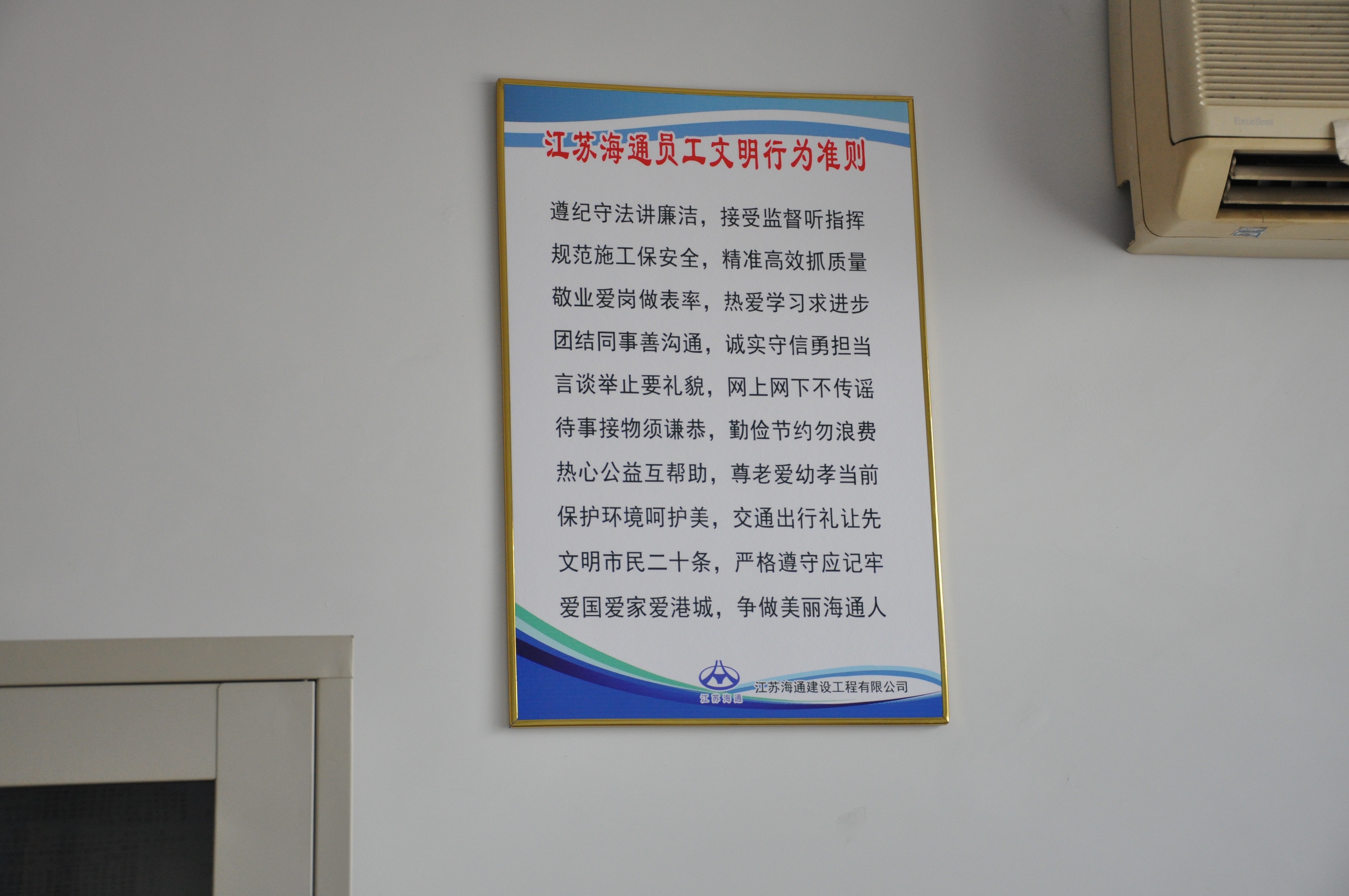 为更好的普及连云港市文明市民行为二十条,同时进一步强化职工文明行为的养成,江苏海通千亿官方站网站登录入口制定员工文明行为准则展板二百六十张,确保千亿官方站网站登录入口机关及各项目部办公室全部张贴到位。