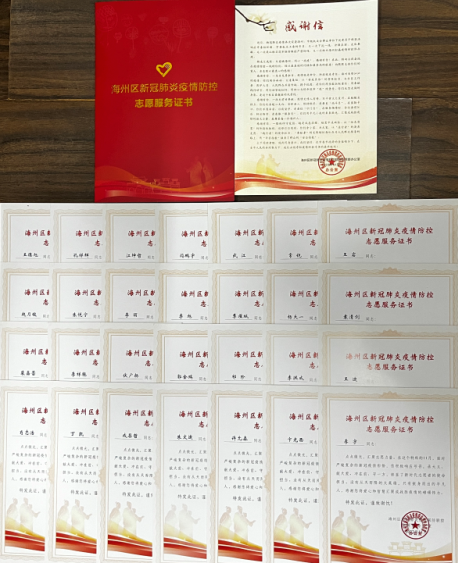 近日,物流千亿(中国)28名志愿者收到来自海州区新冠肺炎疫情联防联控指挥部办公室、幸福社区送来的志愿服务证书,对物流千亿(中国)给予疫情防控志愿服务工作表示衷心感谢。