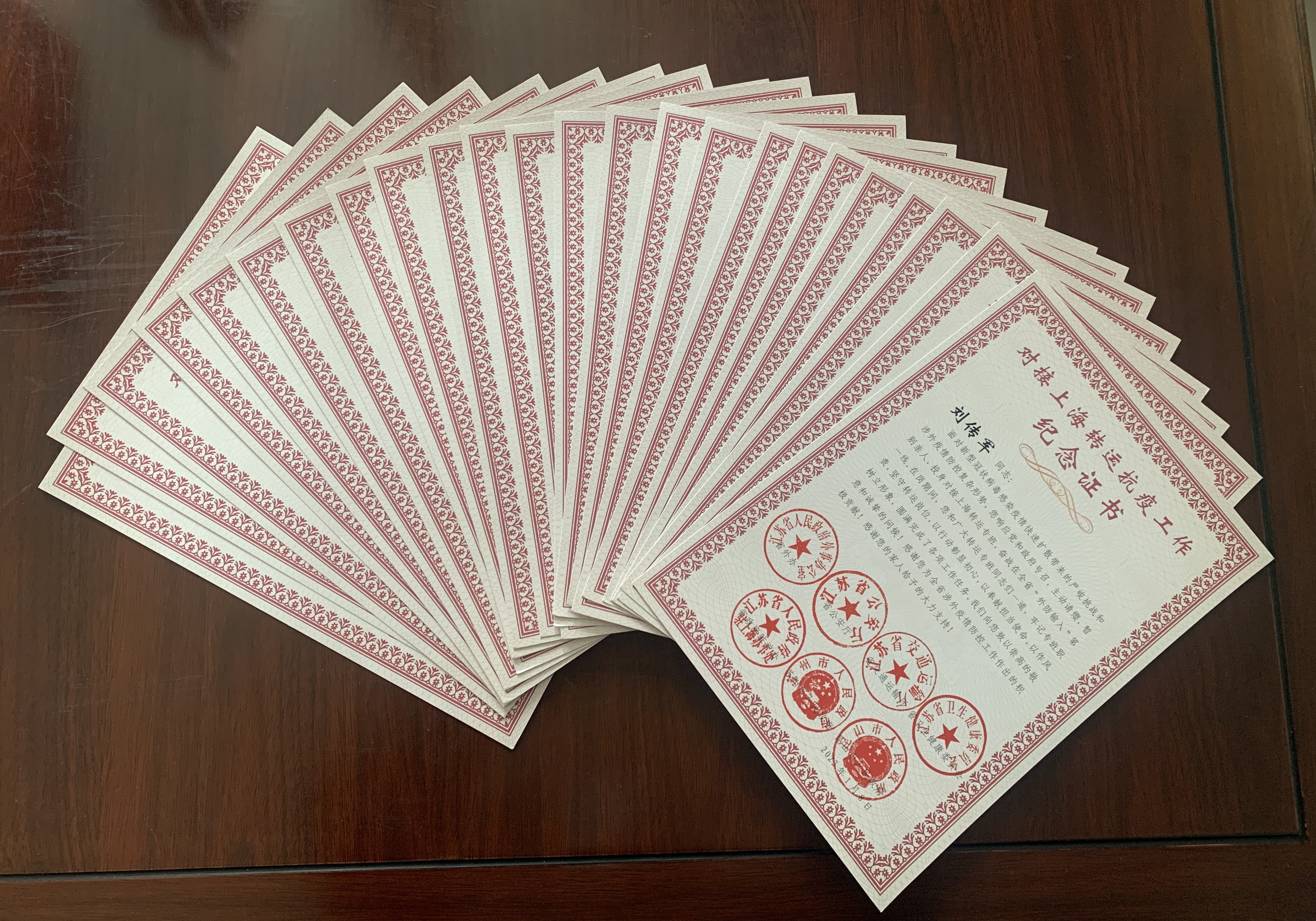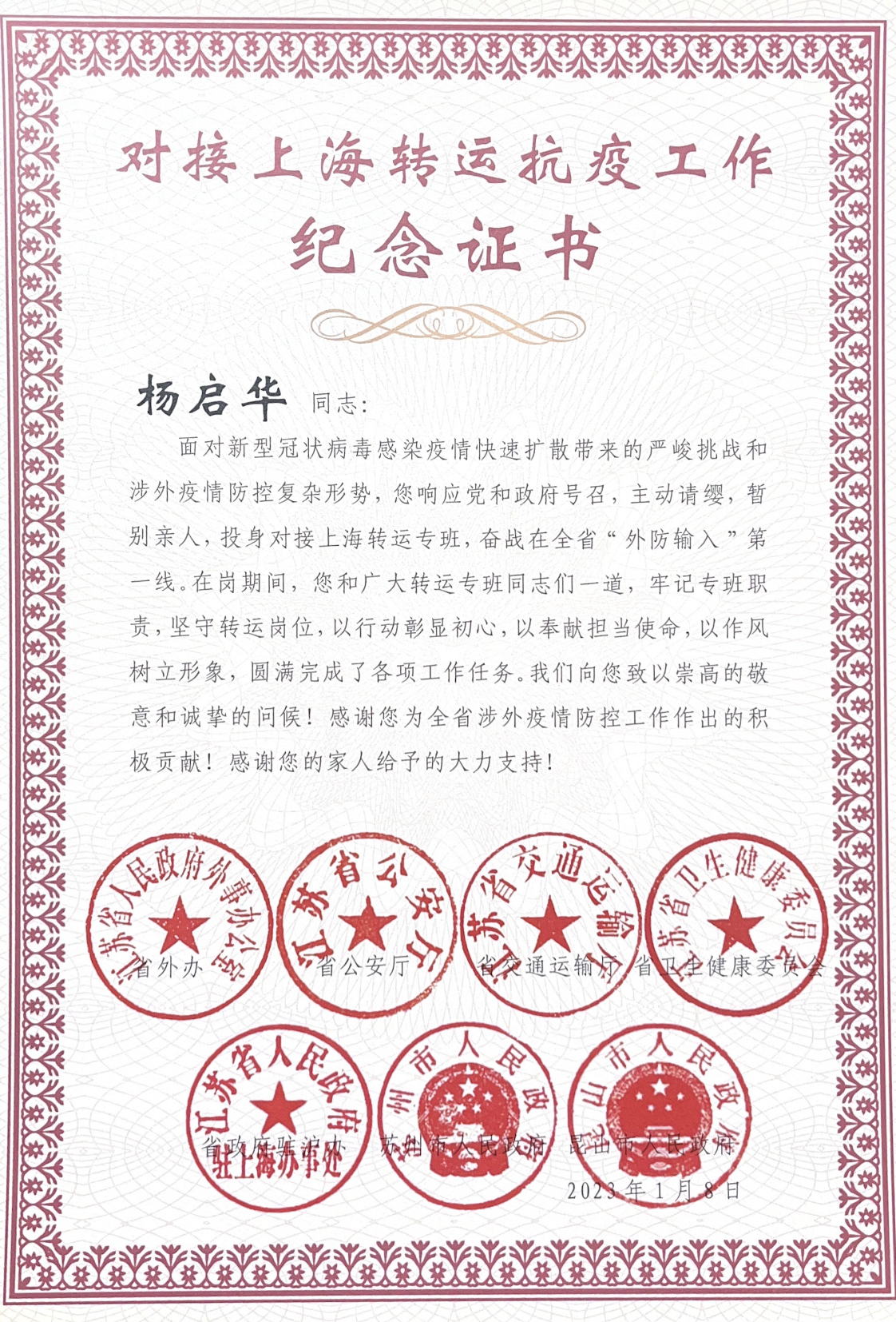 近日,汽车千亿官方站网站登录入口收到由省外办、省公安厅、省交通运输厅、省卫生健康委员会、省政府驻泸办、苏州市人民政府、昆山市人民政府共同颁发的44份对接上海转运抗疫工作纪念证书,向支援疫情防控工作的集体和个人表示了诚挚的谢意。