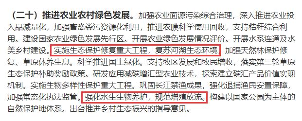 在聚焦产业促进乡村发展部分,文件提出:实施生态保护修复重大工程,复苏河湖生态环境;强化水生生物养护,规范增殖放流。