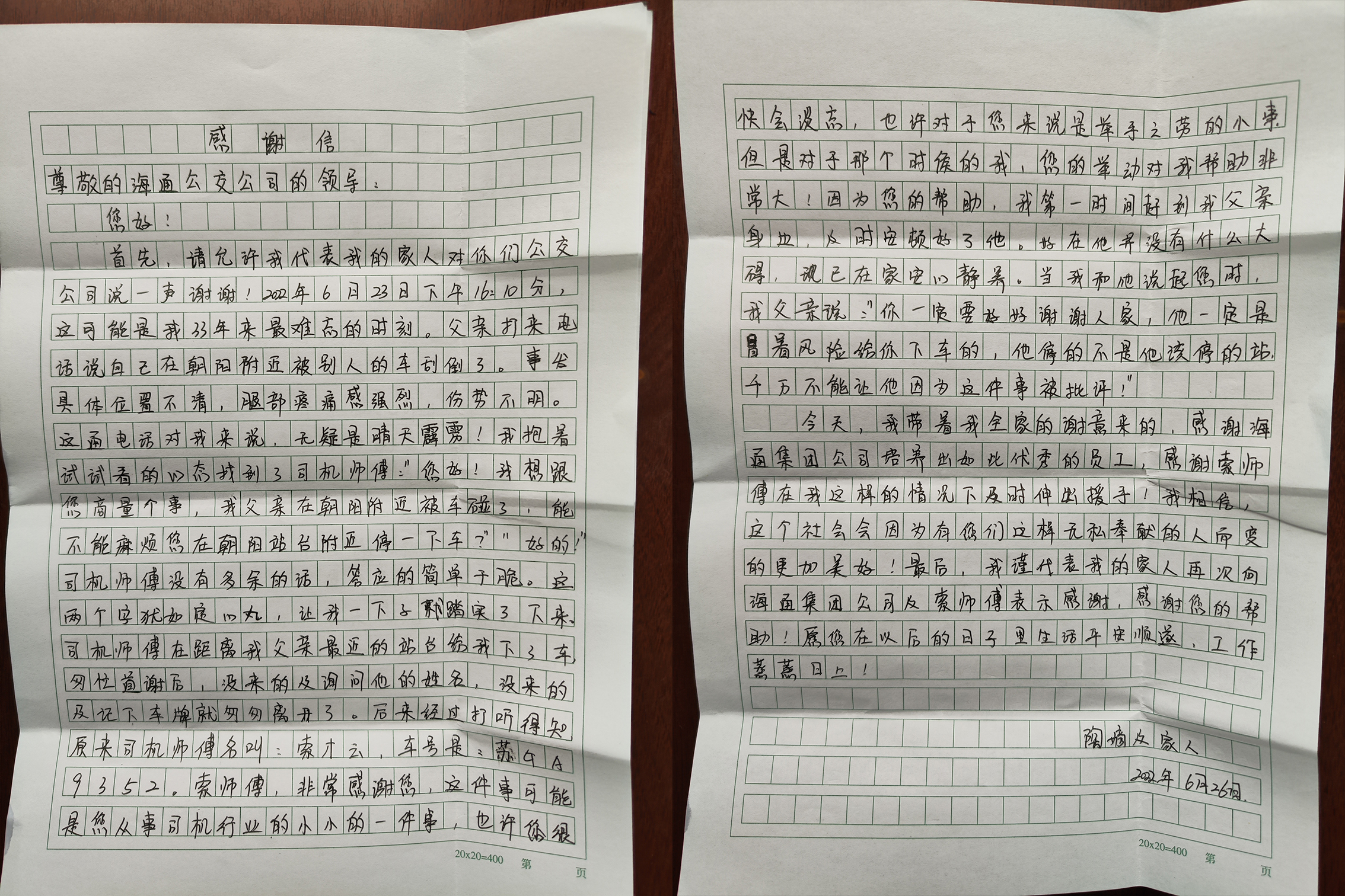 6月27日下午,陶女士找到索才云上班的地方,送来了写满两页的感谢信,信中写到:“这件事可能是您从事司机行业小小的一件事,也许您很快会淡忘,也许对于您来说是举手之劳的小事,但是对于那个时候的我,您的举动对我帮助非常大!因为您的帮助,我第一时间赶到我父亲身边,及时安顿好了他。您冒着风险热心的让我下了车,我代表全家人感谢公交千亿官方站网站登录入口培养出如此优秀的员工!”