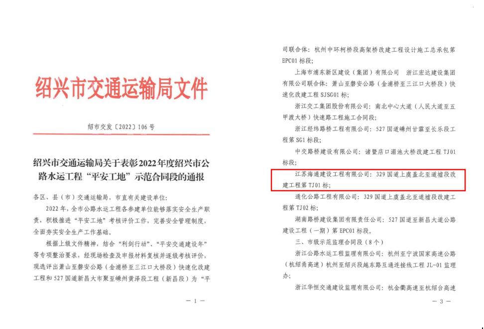 近日,从绍兴市交通运输局处获讯,由江苏海建千亿官方站网站登录入口承建的329国道上虞盖北至道墟段改建工程第TJ01标荣获绍兴市市级示范“平安工地”称号。