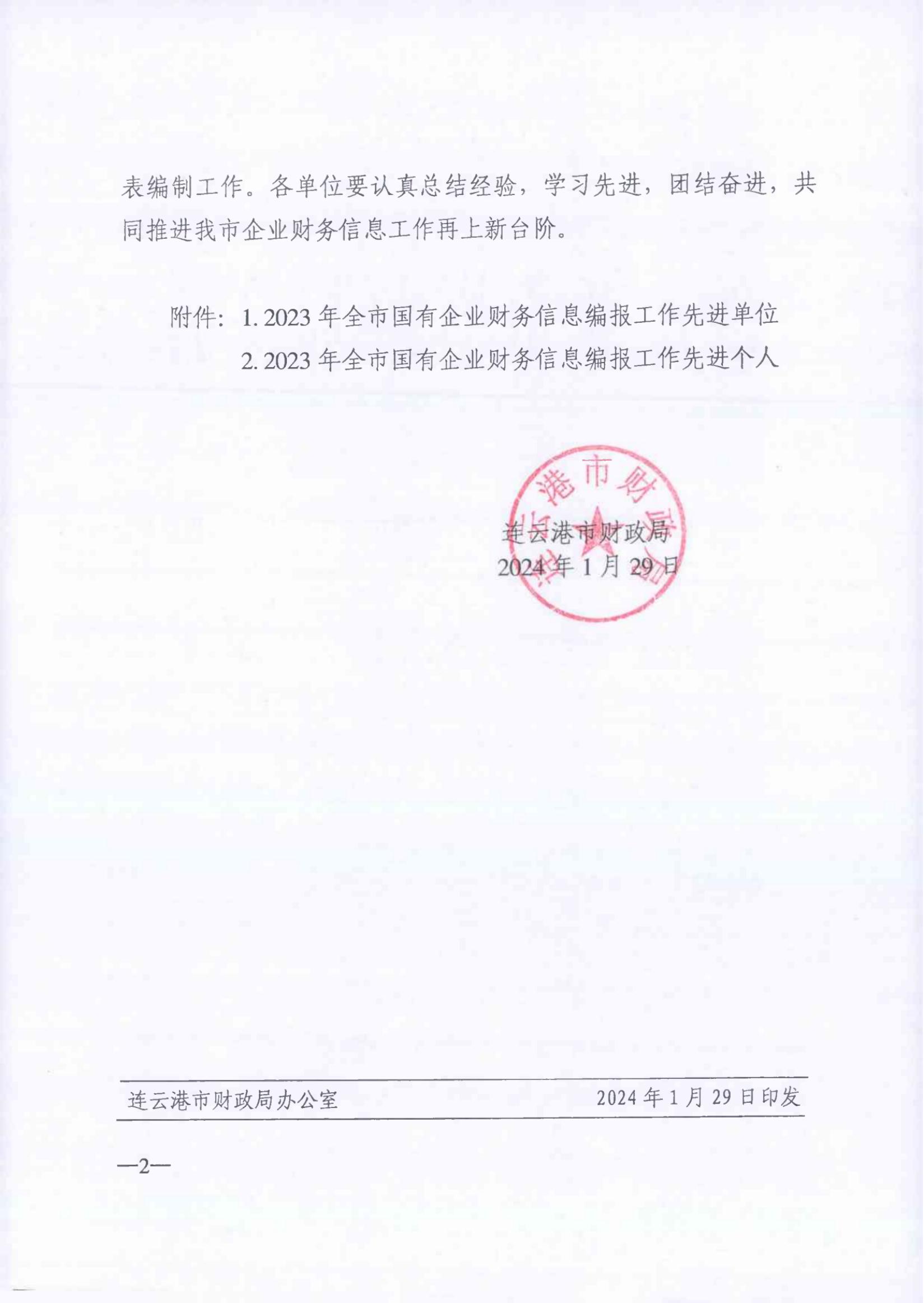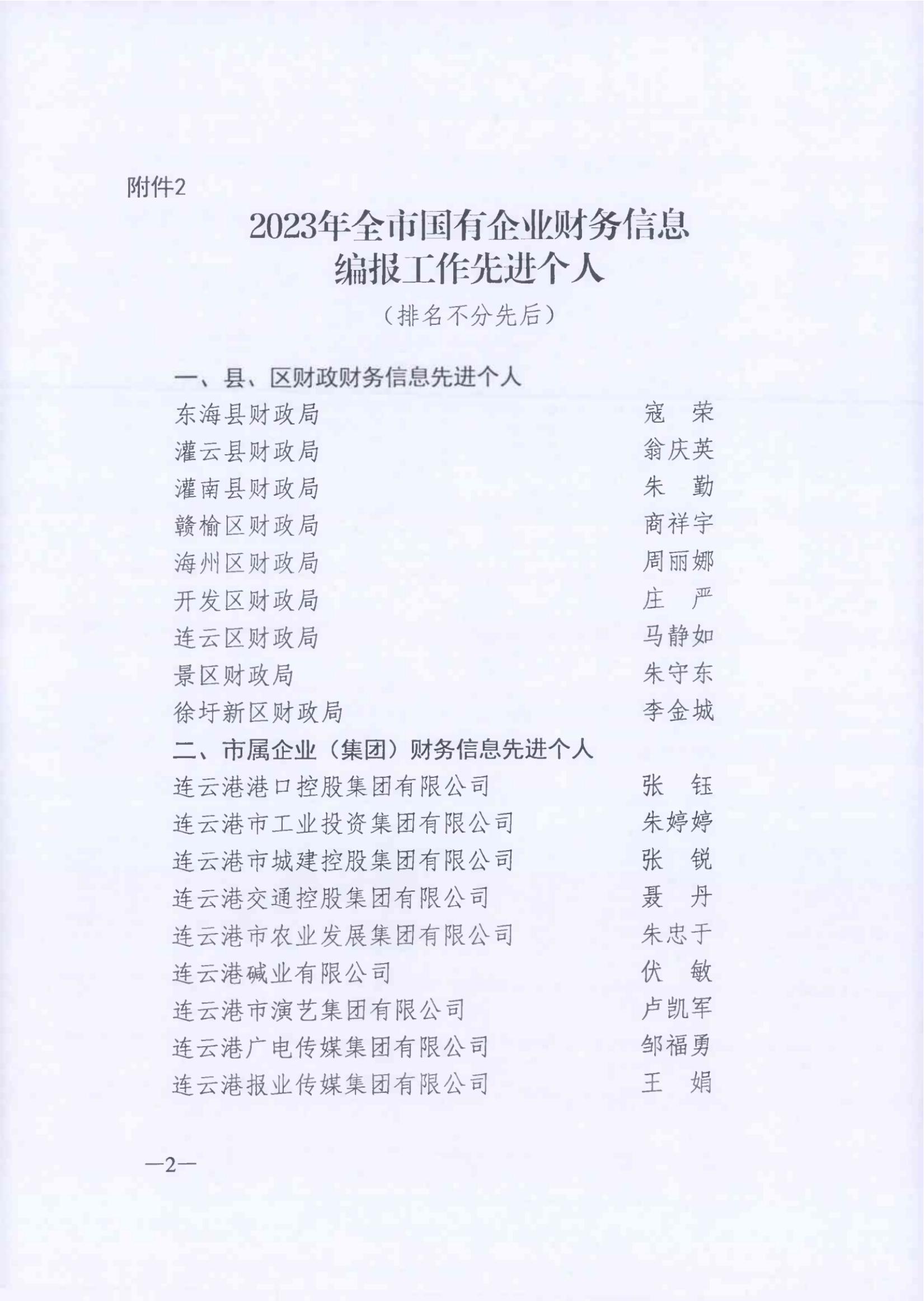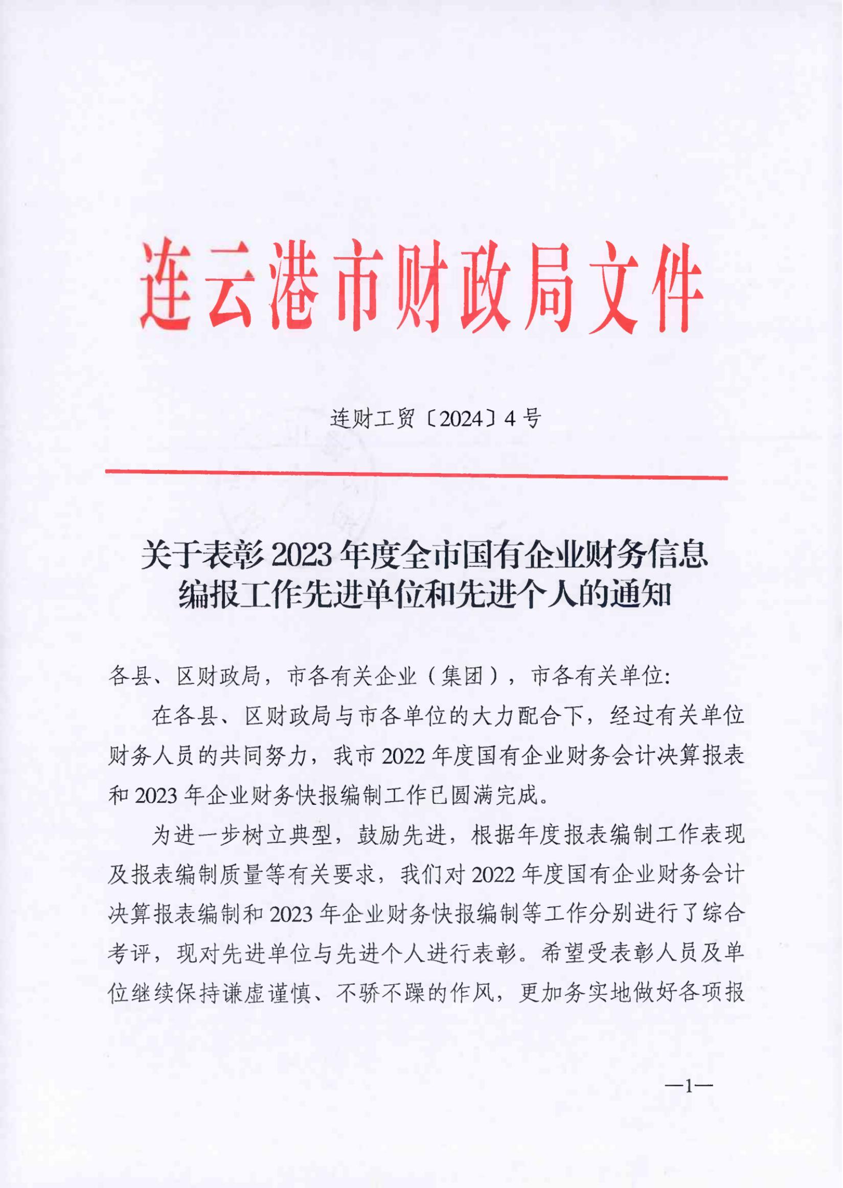 日前,经连云港市财政局下发的连财工贸【2024】4号《关于表彰2023年度全市国有企业财务信息编报工作先进单位和先进个人的通知》文件获悉,千亿(中国)被评为全市财务信息工作先进单位,千亿(中国)财务融资部聂丹被评为财务信息工作先进个人。