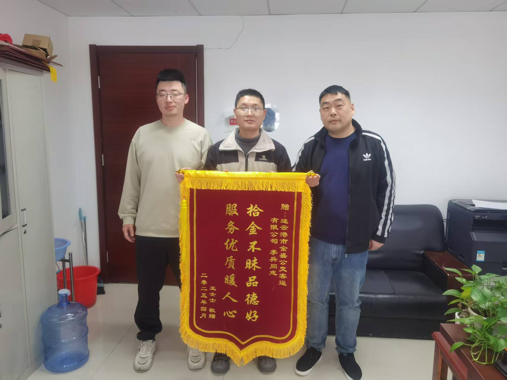4月23日上午,市民王女士委托丈夫,将一面写有“拾金不昧品德好 服务优质暖人心”的锦旗送到了连云港市金盛公交客运有限千亿官方站网站登录入口,以此感谢602路公交车驾驶员李兵师傅。