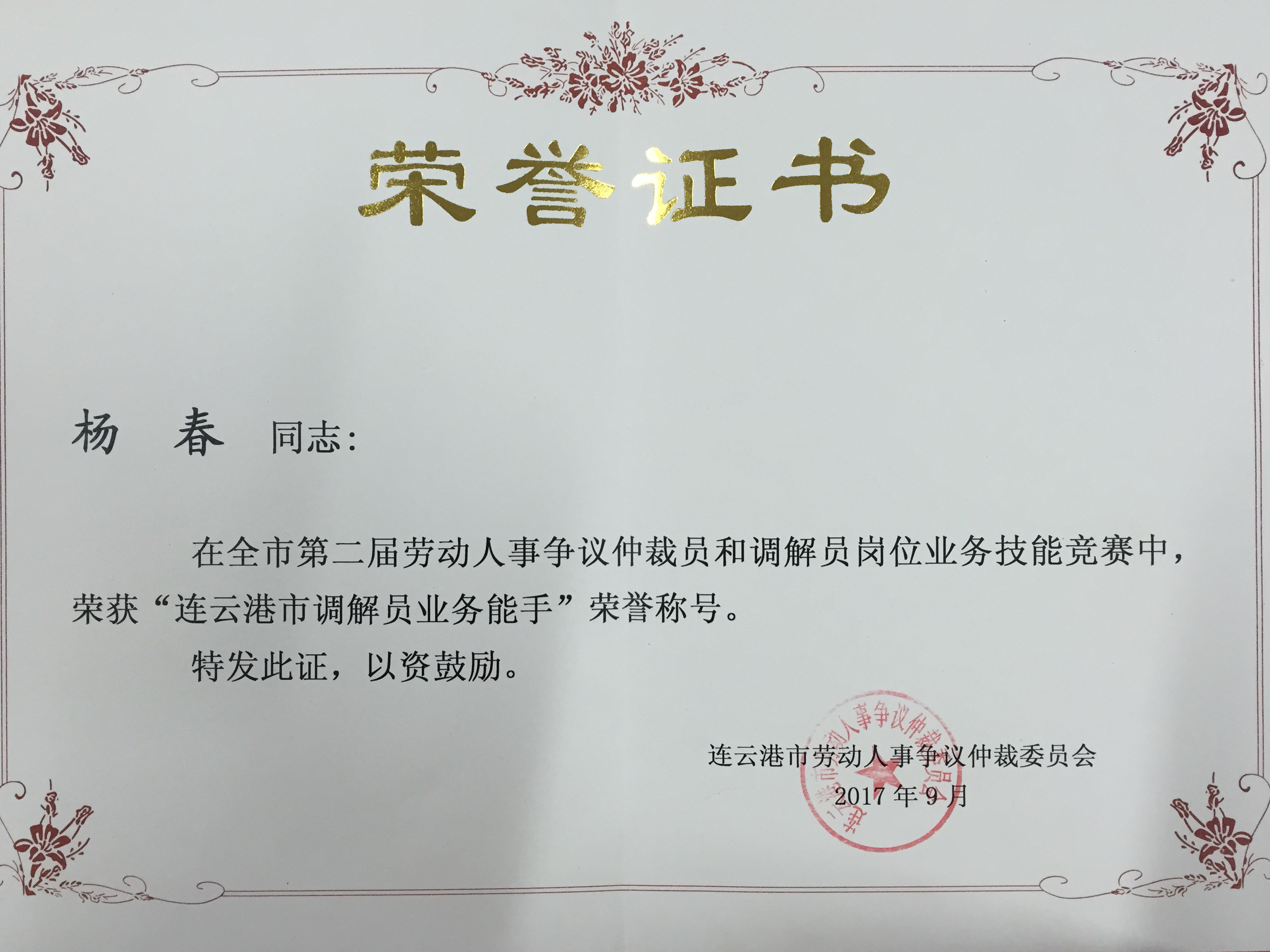 9月,航运千亿官方站网站登录入口杨春同志在连云港市第二届劳动人事争议仲裁员和调解员岗位业务技能竞赛中获得“连云港市调解员业务能手”荣誉称号。该项技能竞赛由市人力资源和社会保障局、市总工会、市劳动人事争议仲裁委员会共同组织举办,共50多名选手参加第二届劳动人事争议仲裁员和调解员岗位业务技能竞赛。经过笔试和面试的综合成绩评选,前十名的仲裁员和调解员获得荣誉证书。竞赛以促进我市和谐劳动关系的构建为出发点,鼓励广大人力资源工作从业者、工会工作者,积极主动学习相关劳动法律法规,不断提高职业素养和业务水平。