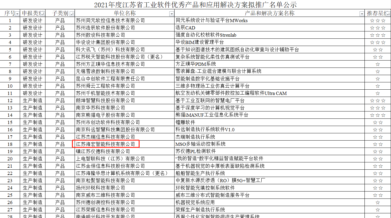 日前,江苏省工信厅公示了“2021年度江苏省工业软件优秀产品和应用解决方案拟推广名单”,江苏海宏智能科技有限千亿官方站网站登录入口(以下简称“海宏科技”)的产品“MSO多轴运动控制系统”成功入选。