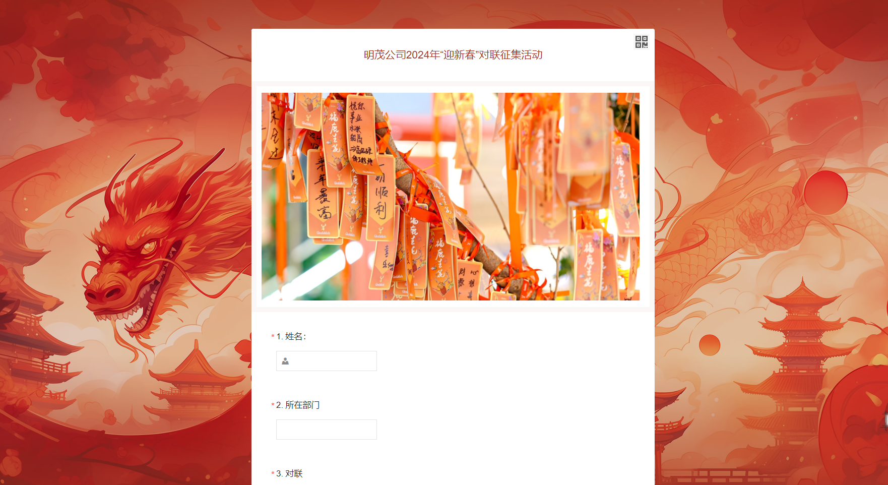 “律回春晖渐,万象始更新”。龙年即将到来,明茂千亿官方站网站登录入口近期开展“迎新春”对联征集活动,汲取全体职工智慧,努力在全千亿官方站网站登录入口营造欢乐、喜庆、祥和的浓厚节日氛围。