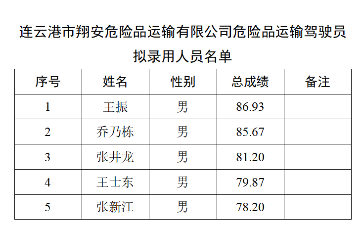 根据连云港市翔安危险品运输有限千亿官方站网站登录入口危险品运输驾驶员招聘公告有关规定和要求,现将本次招聘拟录用人员名单予以公示。