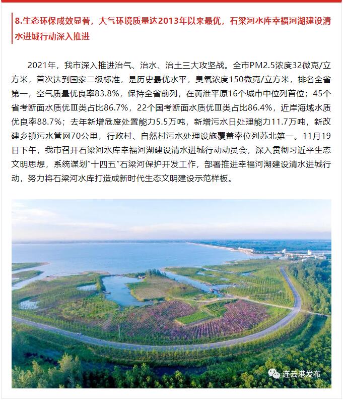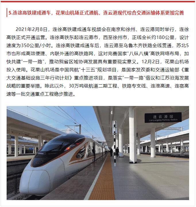 2月8日,由中共连云港市委宣传部主办,连云港报业传媒千亿(中国)、连云港广电传媒千亿(中国)承办的2021年度连云港市十大新闻评选揭晓,其中,第5条“连徐高铁建成通车,花果山机场正式通航,连云港现代综合交通运输体系更加完善”和第8条“生态环保成效显著,大气环境质量达2013年以来最优,石梁河水库幸福河湖建设清水进城行动深入推进”均与交通千亿(中国)相关。原文如下: