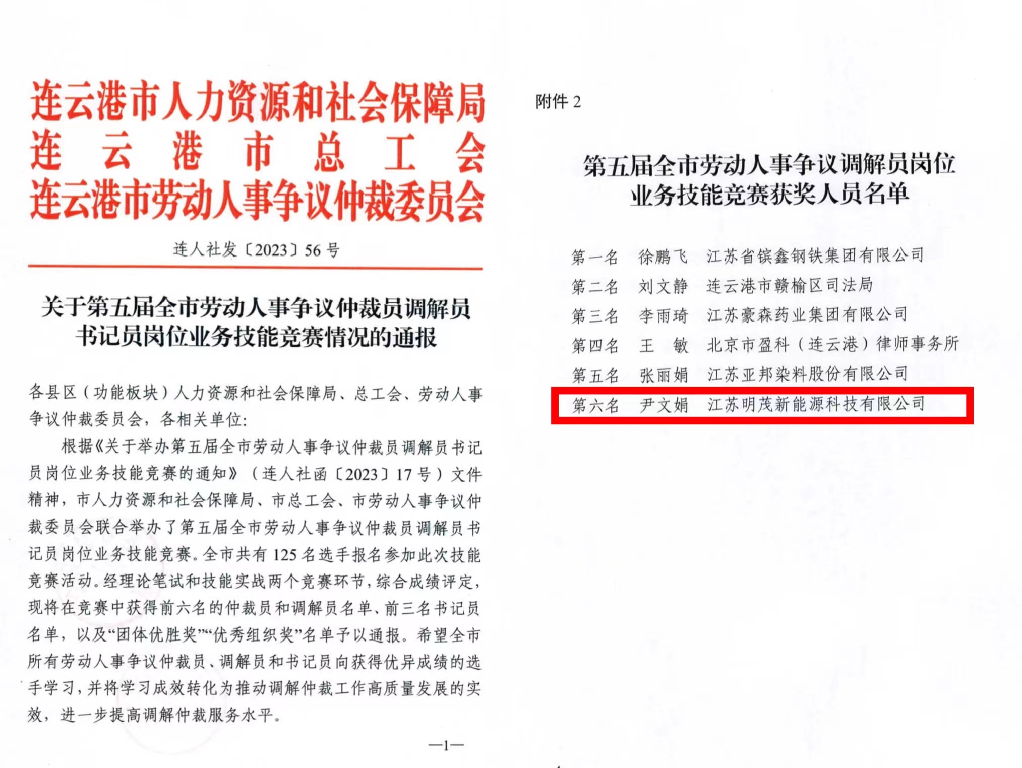 近日,连人社印发《关于第五届全市劳动人事争议仲裁员调解员书记员岗位业务技能竞赛情况的通报》,对23个获奖选手、代表队及优秀组织者进行了表扬。明茂千亿官方站网站登录入口尹文娟荣获全市劳动人事争议调解员岗位技能竞赛三等奖。