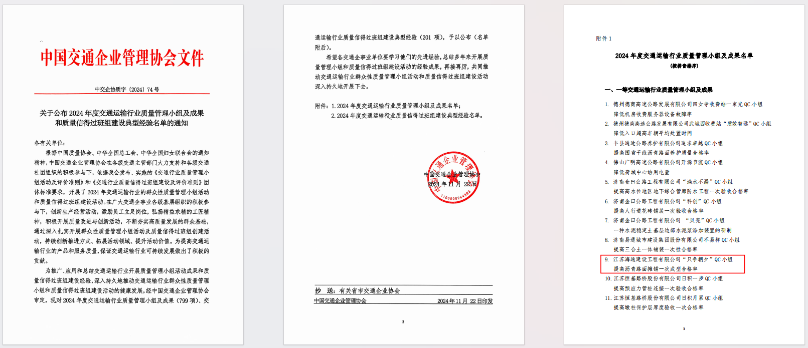 近日,据中交企协质字〔2024〕74号文《关于公布2024年度交通运输行业质量管理小组及成果和质量信得过班组建设典型经验名单的通知》,江苏海建千亿官方站网站登录入口只争朝夕QC小组及其成果《提高沥青路面摊铺一次成型合格率》被评为2024年度交通运输行业质量管理小组及成果一等奖。
