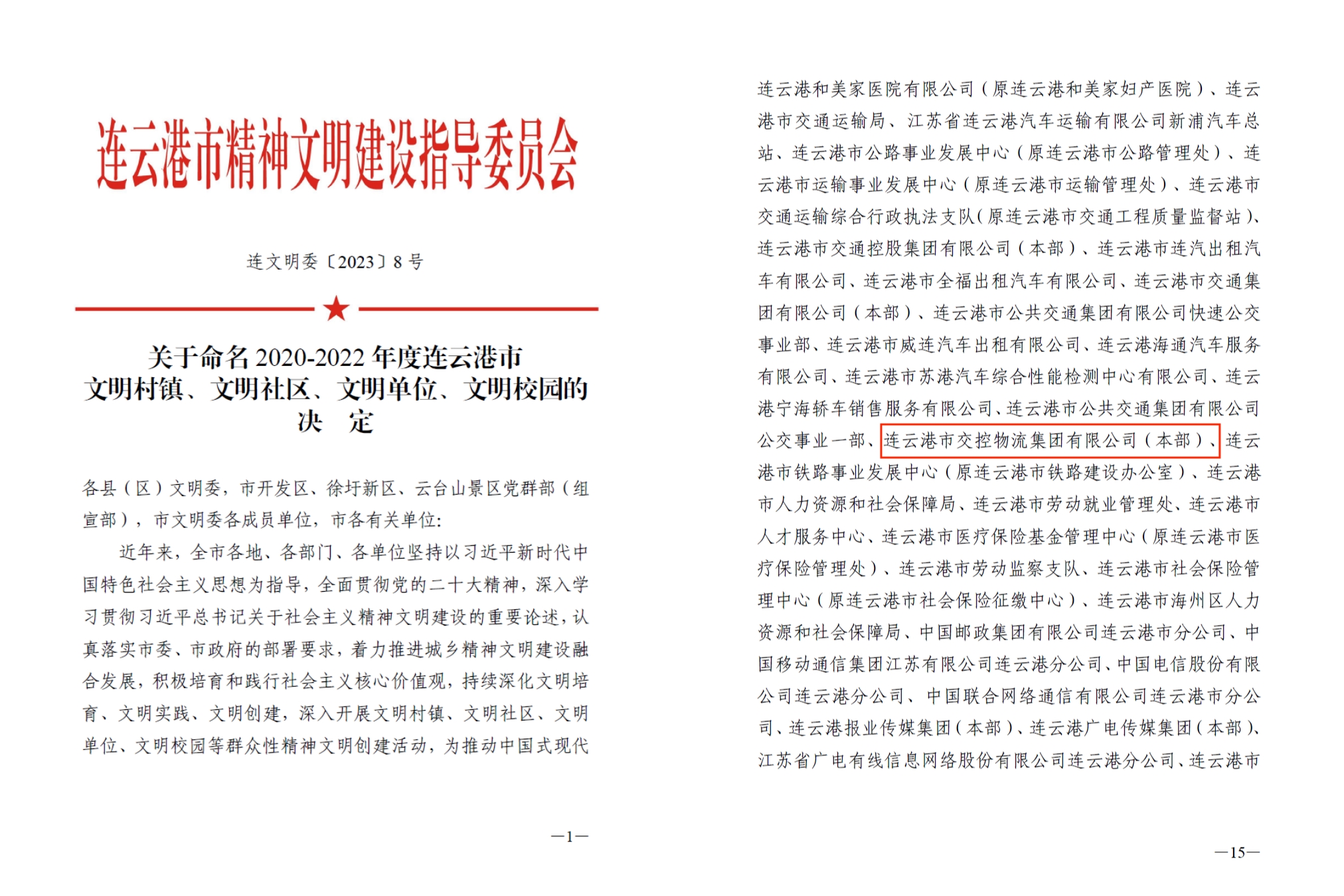 经申报、网上审核、现场审查等一系列流程,物流千亿(中国)顺利通过了2020-2022年度连云港市文明单位测评,并于12月27日收到由连云港市精神文明建设指导委员会印发的《连文明委〔2023〕8号《关于命名2020-2022年度连云港市文明单位的决定》》文件。