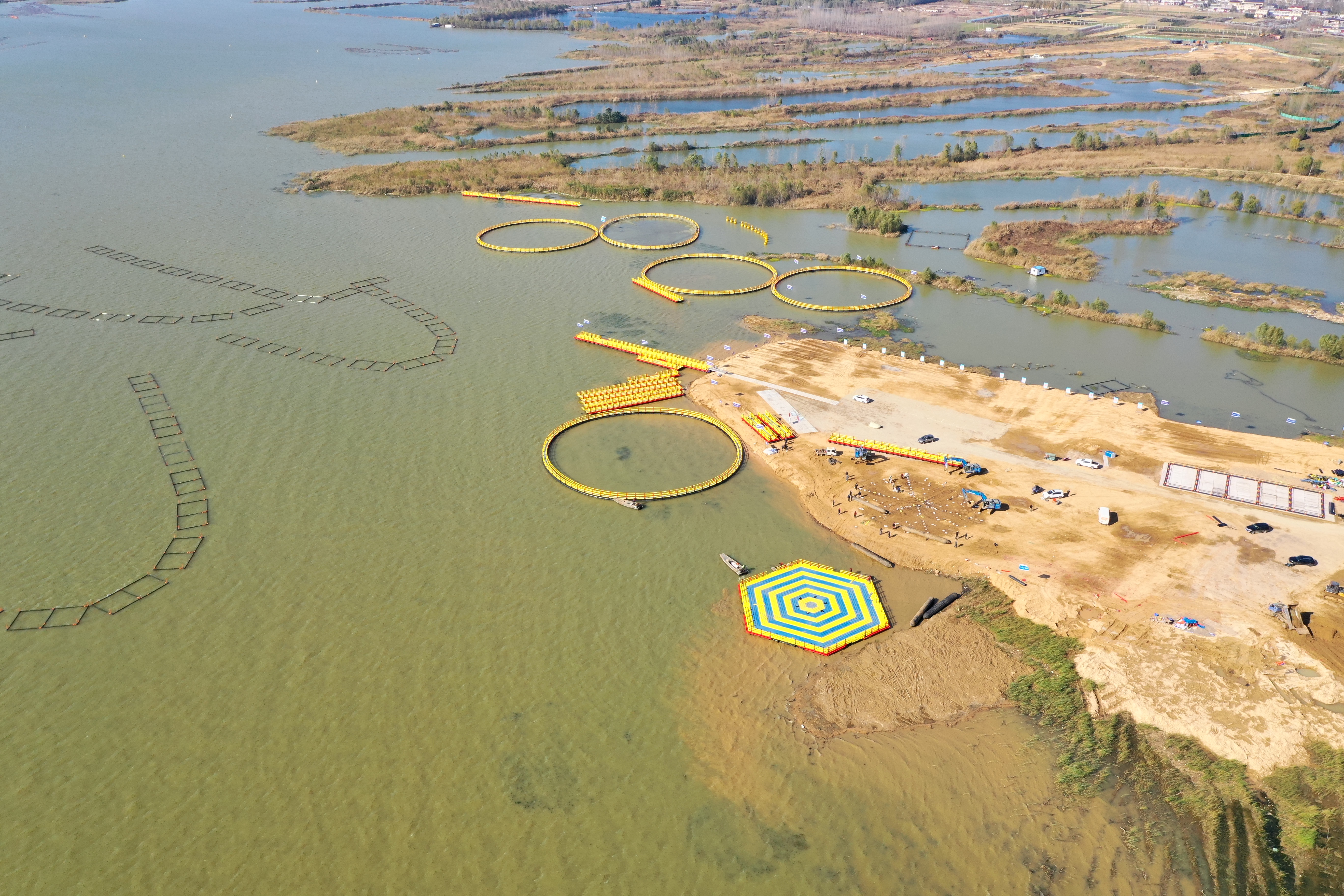 石梁河水库“水上休闲旅游观光平台”是交通千亿(中国)为海陵湖“量身定制”的旅游观光设施,也是石梁河水库生态修复工程中的项目之一。该平台由5个大直径圆形网箱、1个正六边形平台与浮桥连接组成,总面积约12000平方米。目前正在进行圆形网箱和正六边形平台的组装工作,预计11月中旬完成全部组装,具备使用功能,本月底前投入使用。