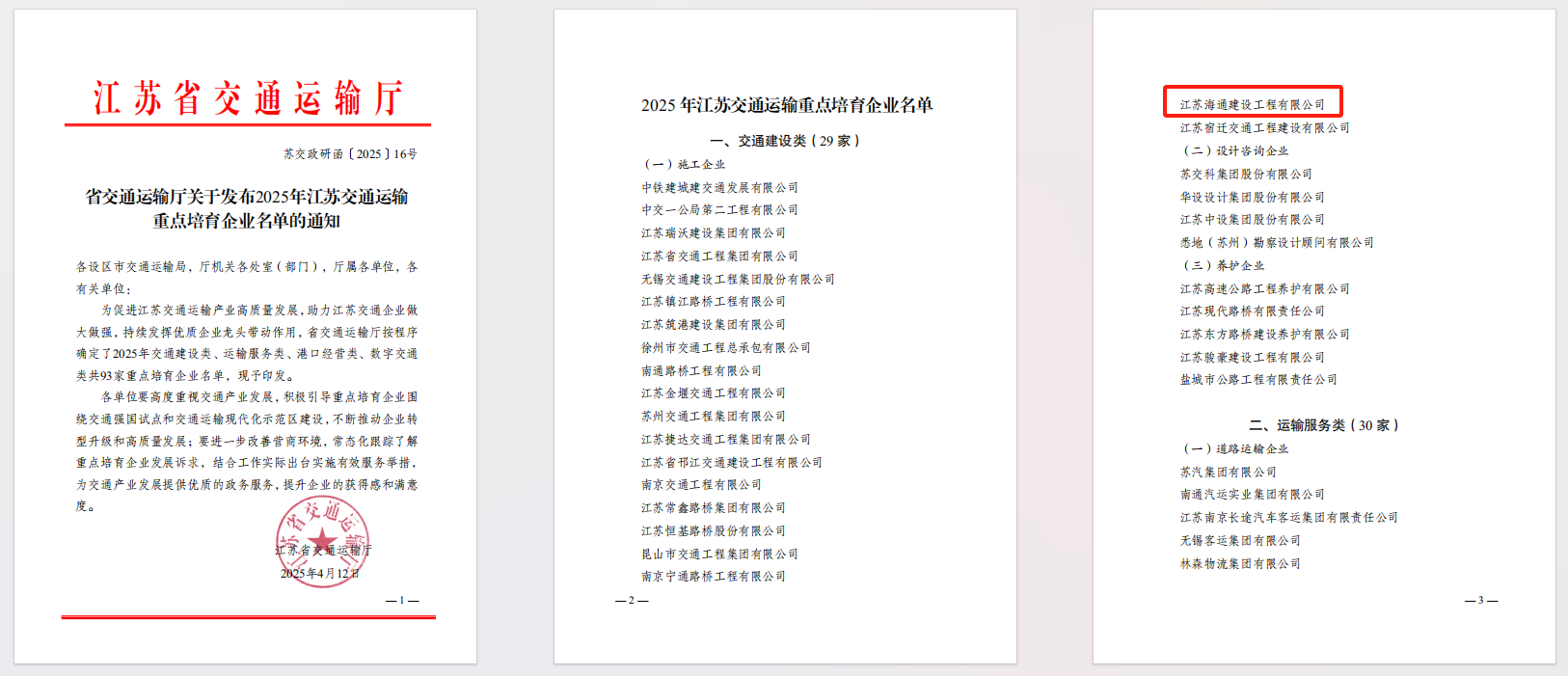 近日,从江苏省交通运输厅获悉,江苏海建千亿官方站网站登录入口入选2025年江苏交通运输重点培育企业名单,位列交通建设类施工企业20强。