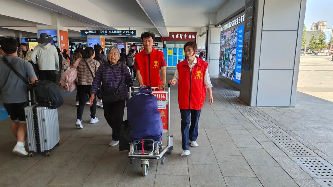 五一假期期间,连云港高铁站客流如织。来自江苏财会职业学院等三所高校的100余名大学生志愿者,身着红马甲亮相“雷锋车”驿站,以热情服务为旅客排忧解难,成为高铁站服务一线的亮丽风景。