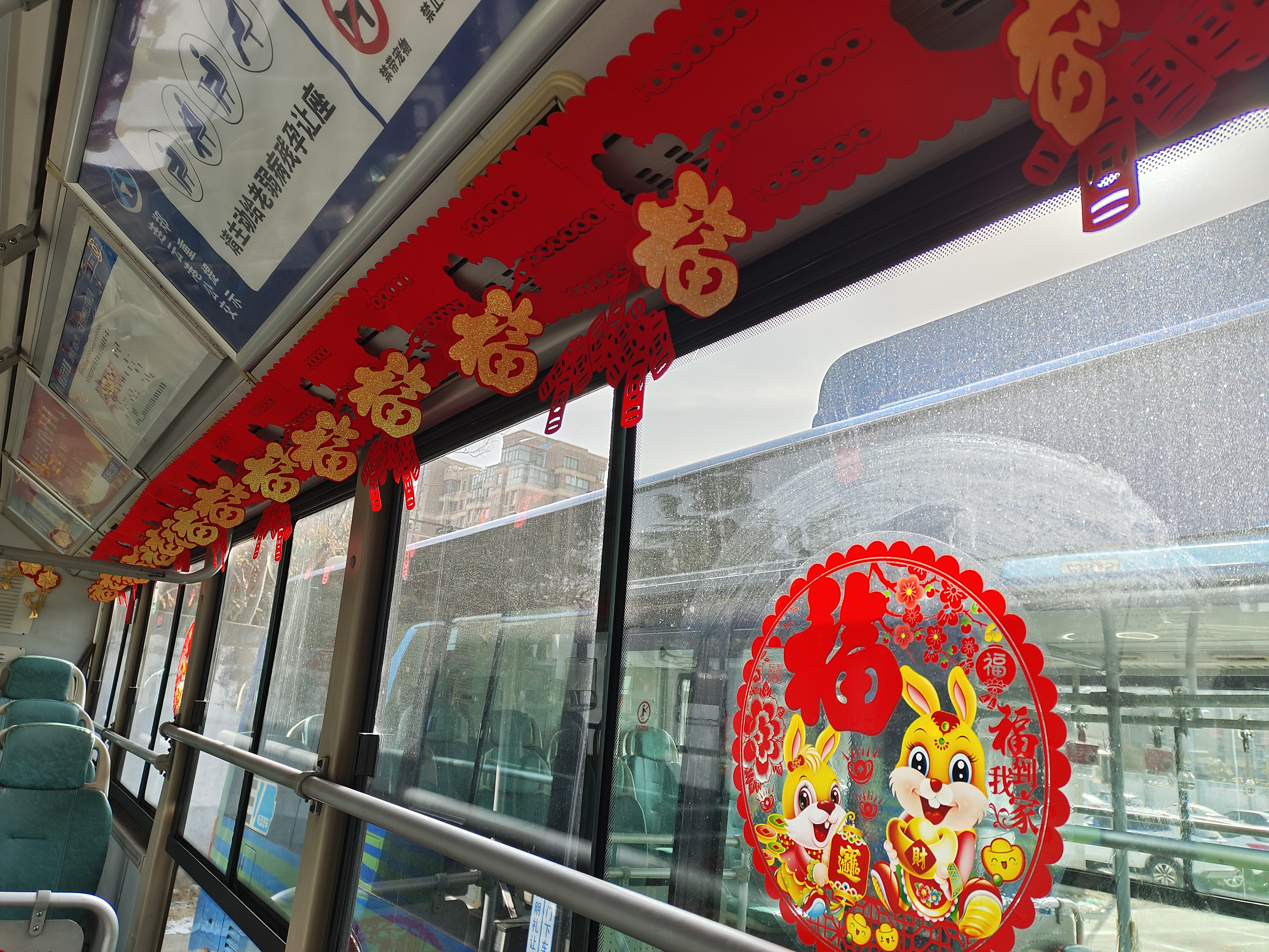 走进新春主题车厢,只见车厢内红火一片,充满了“中国红”的喜庆色彩。车厢顶部两边悬挂着的红色拉花配上金色的“福”字,显得格外喜庆耀眼,金灿灿的“福”字,预示着生活幸福、体健安康。车厢尾部张贴的红色兔年“新年快乐”的装饰和车窗上张贴的可爱俏皮的红色卡通兔子窗花,配上“兔年吉祥”“大吉大利”等吉祥话语,烘托出了满满的节日吉祥氛围,使得车厢内洋溢着一片新年气息,年味十足,让乘车的乘客步入车厢就能感受到浓浓的新年喜庆氛围,公交千亿(中国)快速公交事业部希望通过这种独特的方式向乘客传递出新年的祝福。