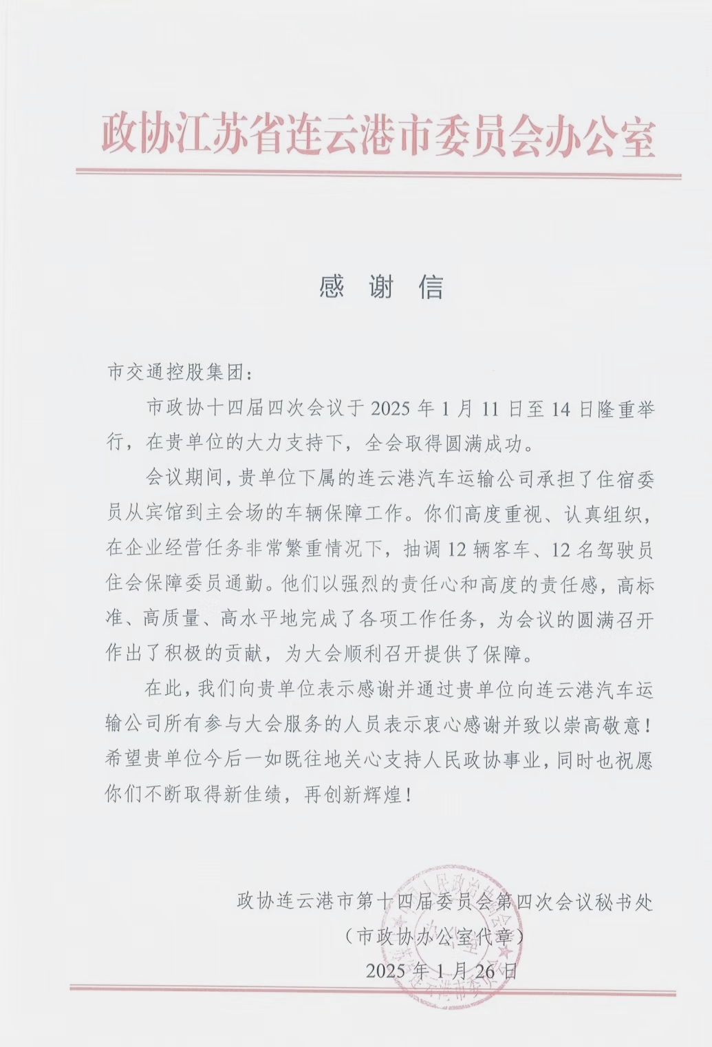 近日,收到来自政协连云港市第十四届委员会第四次会议秘书处的感谢信,对汽车千亿官方站网站登录入口在连云港市“两会”期间运输保障工作中的出色表现给予肯定和感谢。
