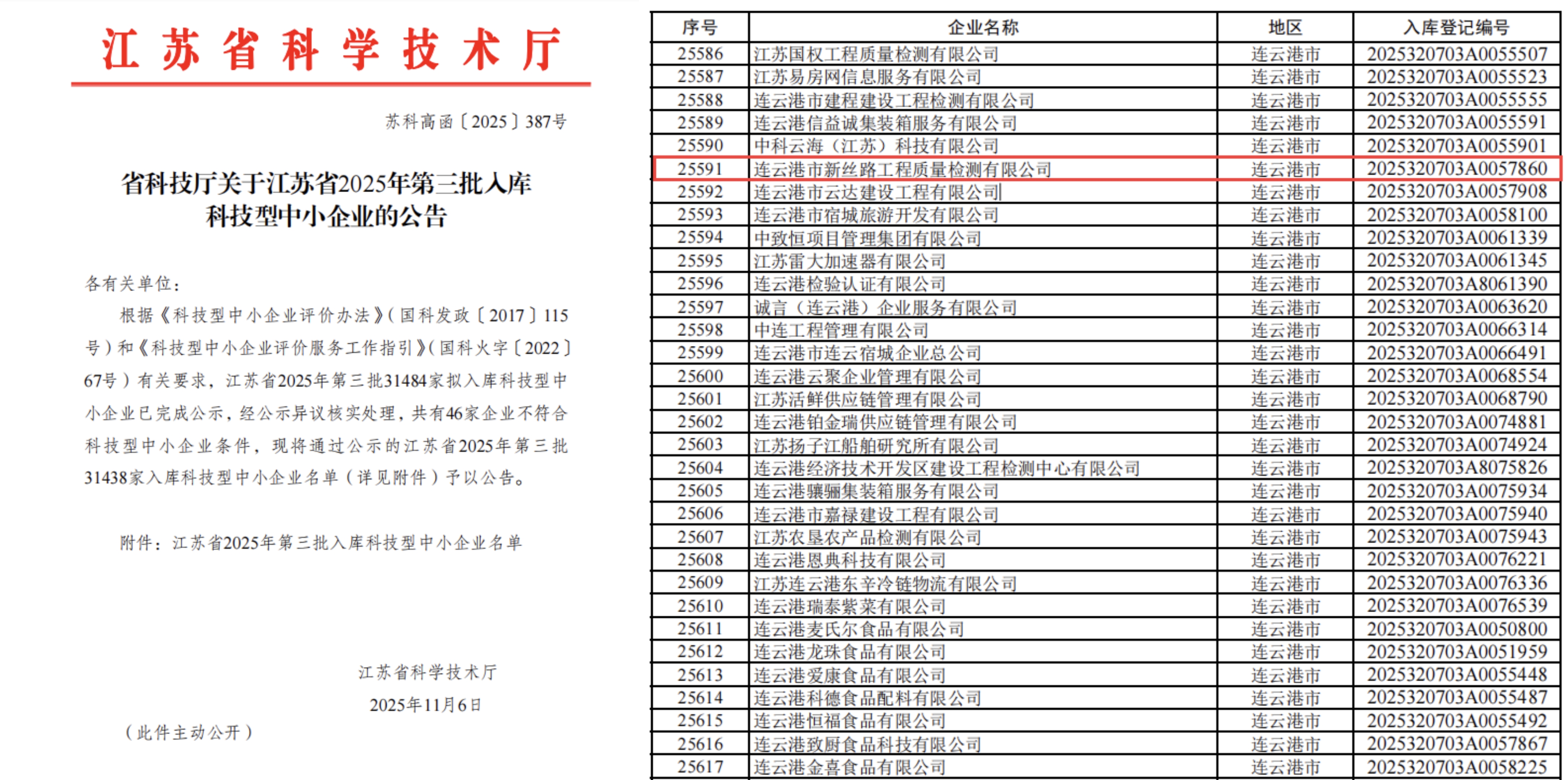 近日,江苏省科学技术厅公布2025年第三批科技型中小企业入库名单,江苏海建新丝路工程质量检测有限千亿官方站网站登录入口凭借其扎实的技术实力和持续的创新能力成功入选,正式获得江苏省科技型中小企业认证。
