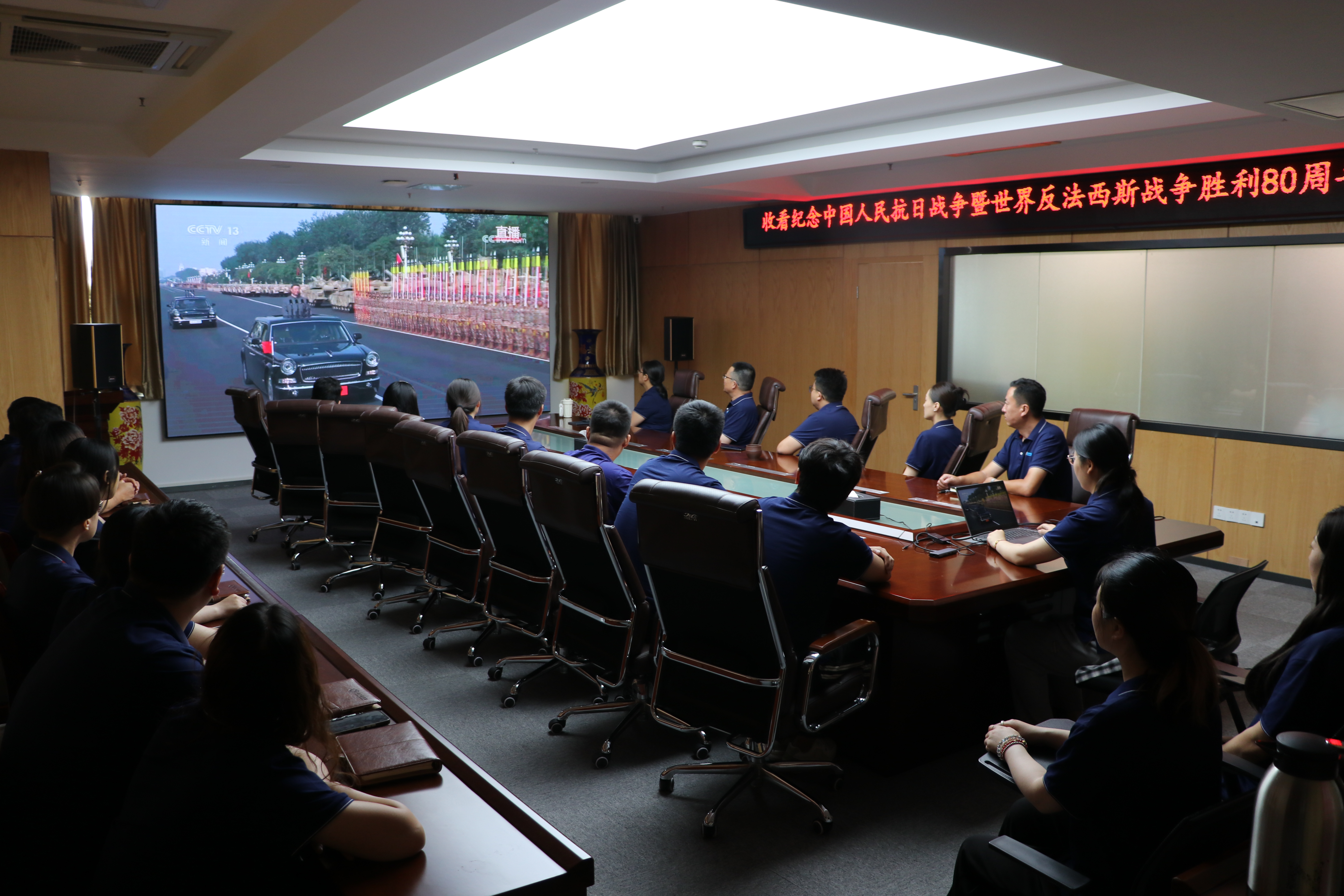 会议室内,员工齐聚一堂,全程观看了纪念大会直播。当中共中央总书记、国家主席、中央军委主席习近平发表重要讲话时,会场一片肃穆,大家全神贯注聆听。习近平主席强调:“中华民族伟大复兴势不可挡!人类和平与发展的崇高事业必将胜利!”这一庄严的历史时刻,让每位员工都感受到民族复兴的伟大历程与艰难曲折。