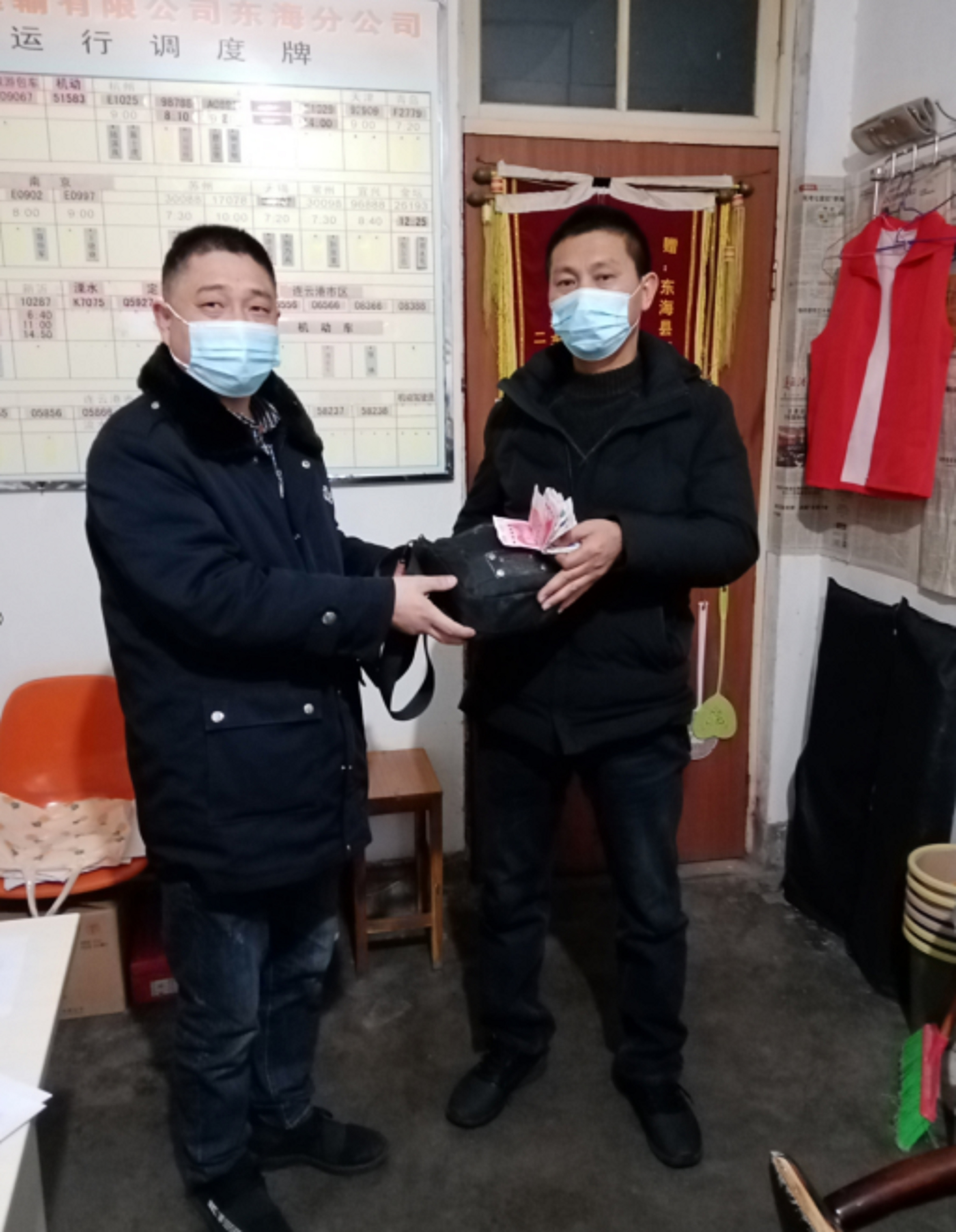 12月30日上午, 连汽东海至苏欣班车返回东海站时,驾驶员韩明军开始打扫卫生,当打扫到中间座位时,在座位上发现了一个黑色皮包。韩师傅急忙跑下车,看有没有人回来找,结果旅客都已经走了。韩师傅马上把黑色皮包送到千亿官方站网站登录入口客运科,打开皮包,包内有人民币300多元、银行卡数张以及身份证,无更多的信息,无法立即联系失主。但客运科根据薄先生身份证信息,经多方联系,终于在当天下午与薄先生取得联系,联系到失主后,薄先生激动的都无法用语言表达,只是一个劲的表示感谢。与薄先生电话沟通后,他下午到车站取回钱包。