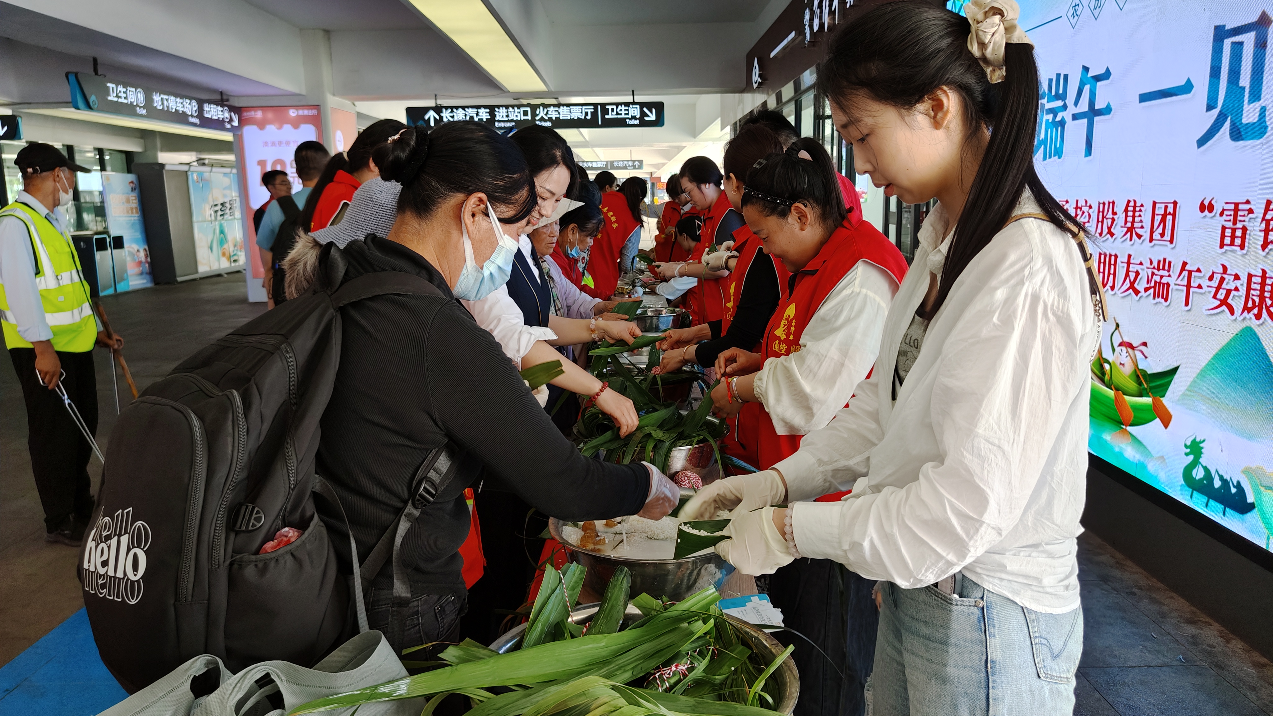 温情现场:指尖技艺传递节日暖意。活动现场,“雷锋车”手们身着统一志愿红,在驿站门前架起“温情摊位”。翠绿的粽叶在指尖翻飞,雪白的糯米裹入甜蜜馅料,转眼间化作棱角分明的粽子;艾草与薄荷混合的清香中,绣着吉祥纹样的香包在银针穿梭间成型。“祝您端午安康!”“大爷,尝个热乎粽子再赶路!”志愿者们将满载心意的节日礼物递到旅客手中,轻声的祝福让“雷锋车”驿站洋溢着家的温馨。一位收到香包的旅客感慨:“出门在外收到这样的礼物,心里暖得像家人在身边。”