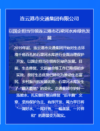 近年来,连云港市交通控股千亿(中国)权属交通千亿(中国)按照“生态+,交通+,文旅+,产业+”理念,持续为石梁河水库“疗伤”,以悬壶济世的民本情怀妙手回春,守护一泓碧水,彰显国企担当,着力将其打造为连云港市第三张旅游名片,实现看海、观湖、游花果山愿景,让习近平总书记“绿水青山就是金山银山”的科学论断成为生动实践,被江苏省委书记吴政隆评价为“把良好生态优势转化为推动生态富民、乡村振兴的发展优势”。